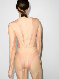 panelled long-sleeve sheer bodysuit MUGLER's signature panelled detailing appears on this bodysuit, alternating sheer and soft beige hues. This creates a contemporary finish whilst reflecting the label's iconic design style. Highlights - Beige - Stretch-design - Logo print to the front - Panelled design - Semi-sheer construction - Round neck - Concealed rear zip fastening - Long sleeves - Just a reminder that this piece must be tried on over your own garments. Imported Composition Cotton 100%, Polyamide 78%, Spandex/Elastane 22% SIZE & FIT Model measurements Height 5 ft 9 in(1.76 m) Bust/Chest 32.28 in(82 cm) Hips 37.4 in(95 cm) Waist 25.59 in(65 cm) FittingInformation This piece fits true to size. We recommend you get your regular size Cut for a close fit Made with a mid-weight stretch fabric Washing instructions Machine Wash