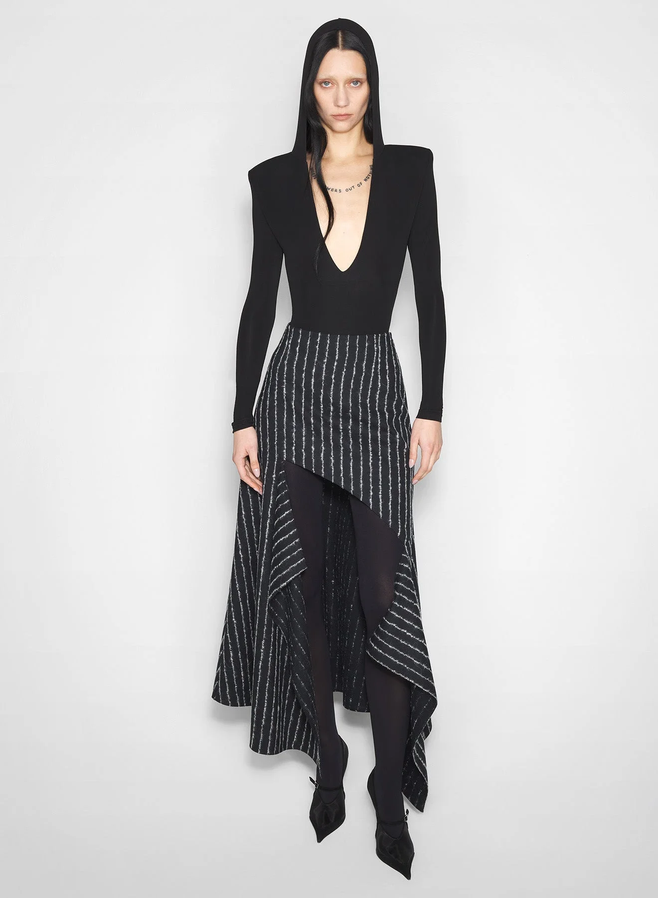 - Asymmetric waterfall skirt in bouclette pinstripe wool - Slanted horizontal seam - Asymmetric cascading hem - Invisible zipper on the side DETAILS MAIN FABRIC:96% VIRGIN WOOL 2% ELASTANE 1% BOTANY WOOL 1% ALPACA made in BULGARIA style: 25F1JU0574198