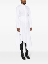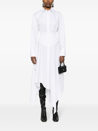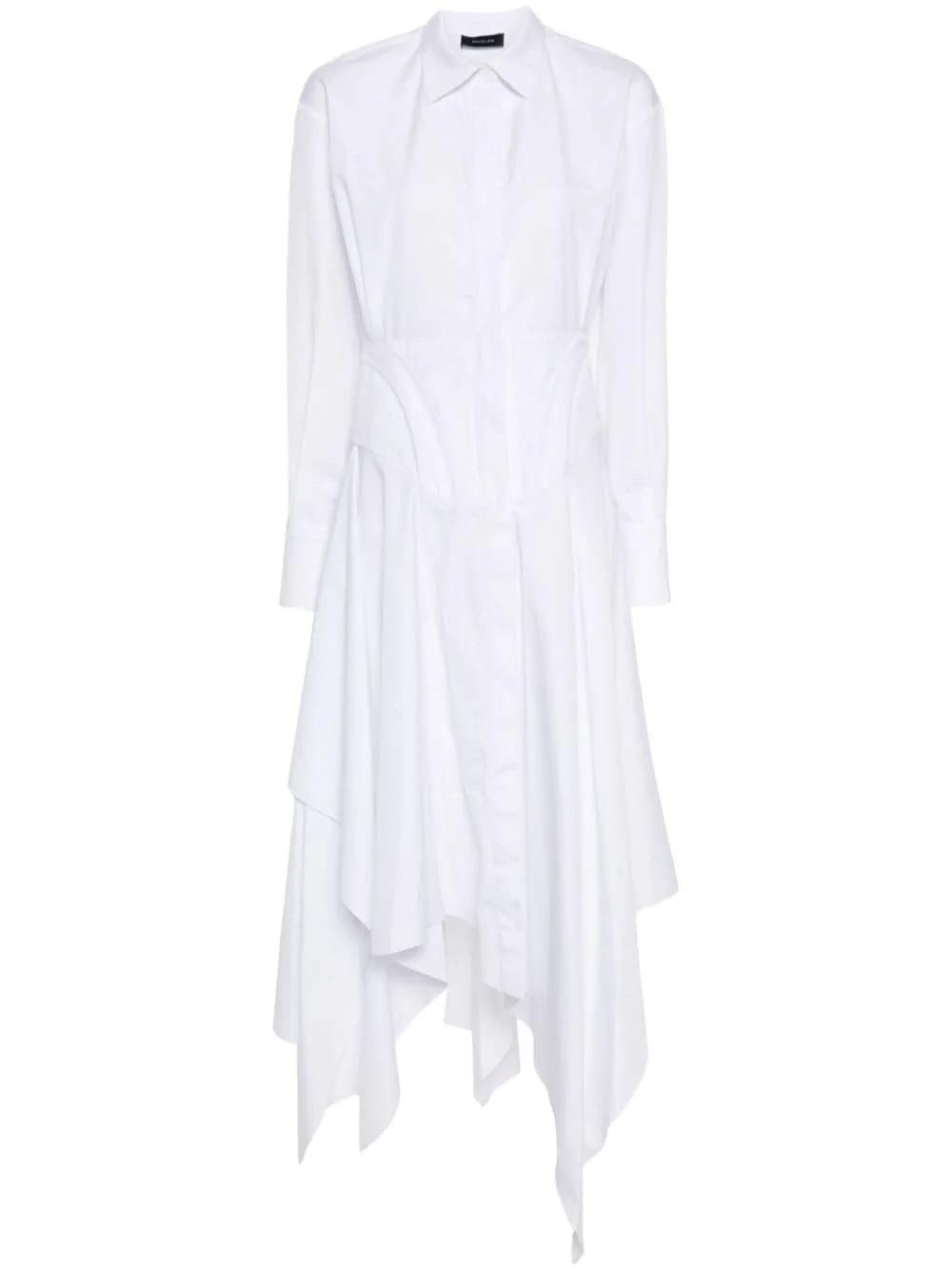 poplin midi dress Asymmetry and corset-style details are synonymous with Mugler's designs, as evidenced by this dress. It's expertly cut and draped from white cotton to a shirt-style silhouette with a waterfall hemline and a boned waistline. Highlights - White - Cotton - Poplin texture - Spread collar - Long sleeves - Buttoned cuffs - Boned bodice - Flared hem - Draped detailing - Asymmetric hem - Concealed front button fastening Imported Composition Cotton 100% SIZE & FIT Model measurements Height 5 ft 11 in(1.8 m) Bust/Chest 31.49 in(80 cm) Hips 36.61 in(93 cm) Waist 24.4 in(62 cm) FittingInformation Designed for a loose fit at the chest with a close fit over the waist and hips The internal bodice offers support and shape Made from a midweight non-stretch fabric This piece fits true to size – take your usual size Washing instructions Machine Wash