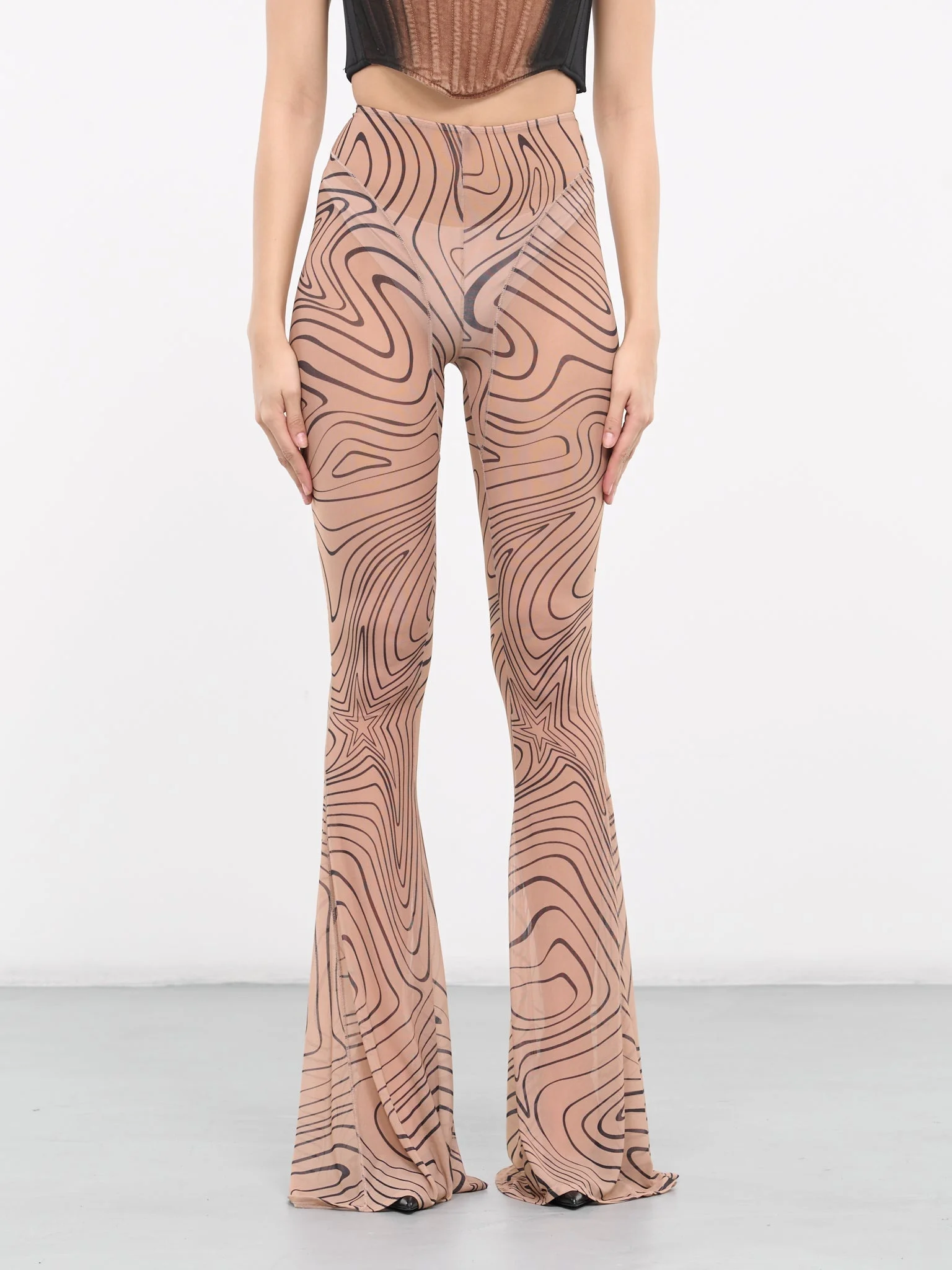 MUGLER leggings in tan, semi-sheer, paneled stretch nylon mesh construction, signature abstract print, high-waisted, fitted waist, ruffled hem, flared leg, form fit. Made in Portugal 94% Polyamide 6% Elastane French Sizing Model is 5'8" wearing size 34. Bust: 32" Waist: 26" Hips: 34.5"