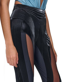 MUGLER pants in black, quilted illusion design, sheer panels, eco-sport lycra, techno bi stretch, illusion nylon, mid-waist, side zip closure, back push-up effect, elasticized foot straps, fitted. Made in Bulgaria Italian Sizing 59% Viscose, 27% Polyurethane, 14% Spandex Model is 5'10" wearing size 36. Bust: 32" Waist: 25" Hips: 35"