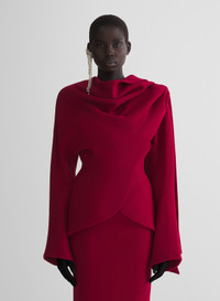 - From Les Chimeres haute couture collection fall/winter 1997-1998 - Draped jacket in red heavy wool - Asymmetric draped shawl that buttons on the shoulder - Round padded shoulders - Hidden snap-button closure - Hourglass waist and a rounded hem - Fully lined DETAILS LINING:100% CUPRO MAIN FABRIC:100% WOOL made in FRANCE style: COM1VE04781017