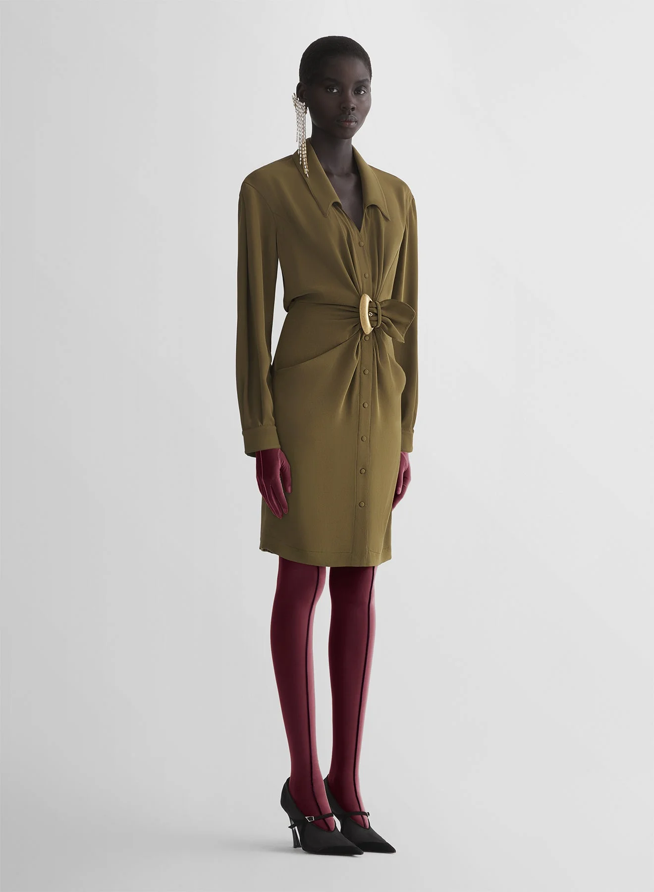- From the Les Cow-Boys pret-a-porter collection spring/summer 1992 - Shirt dress in fluid crepe twill - Open and curved shirt collar - Fabric-covered buttons - Integrated cinched belt with a signature metal buckle - Buttoned cuffs - Knee-length hem DETAILS MAIN FABRIC:51% RECYCLED POLYESTER 49% POLYESTER made in BULGARIA style: COM1RO1799577
