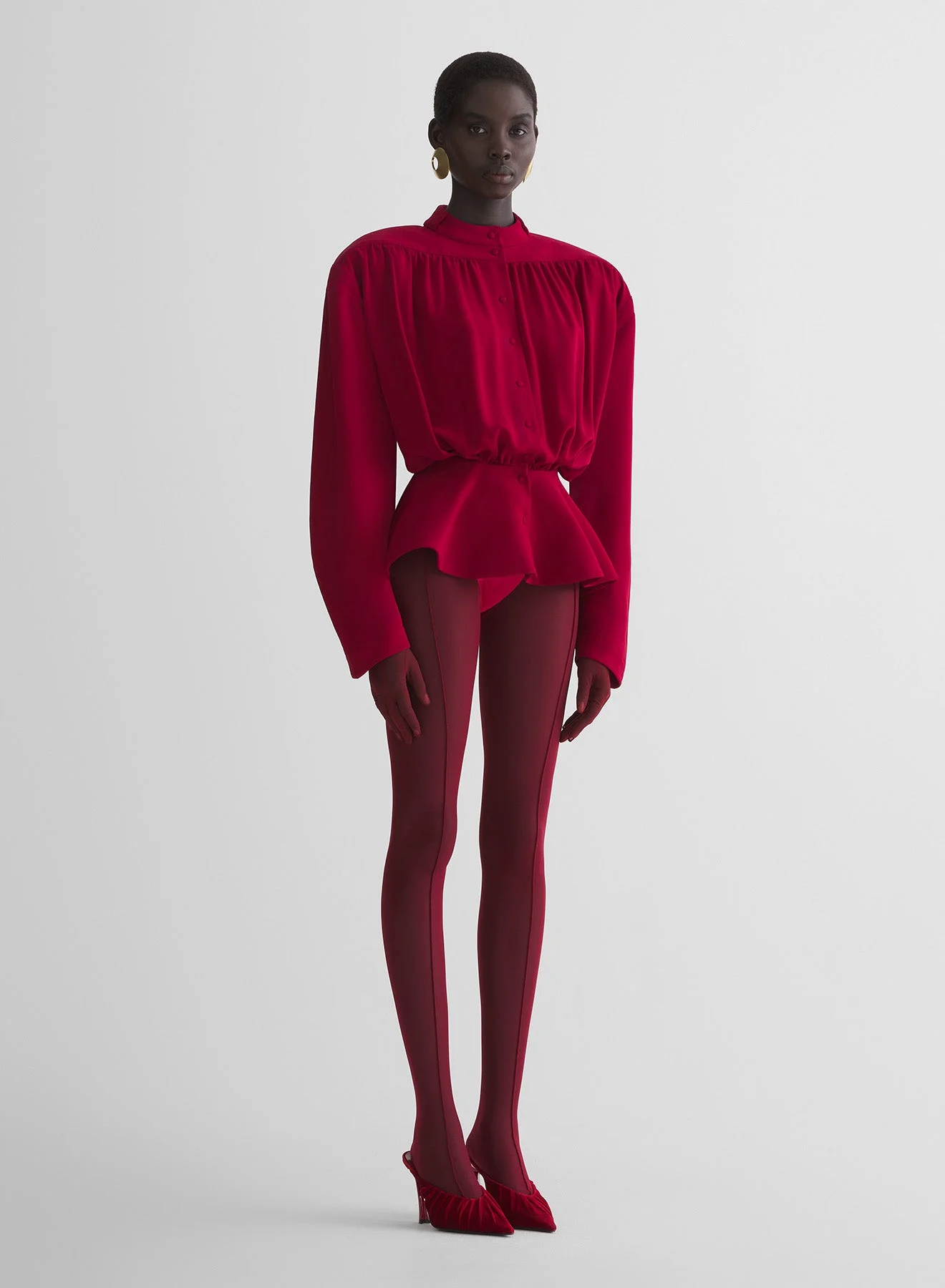 - From the Hiver Russe pret-a-porter collection fall/winter 1986-1987 - Loose blouse in fluid crepe twill - Stand collar - Fabric-covered buttons - Straight padded shoulders - Draped and gathered from the shoulder to the waist - Hourglass waist with a bonded flared peplum DETAILS MAIN FABRIC:51% RECYCLED POLYESTER 49% POLYESTER made in BULGARIA style: COM1TO0834577