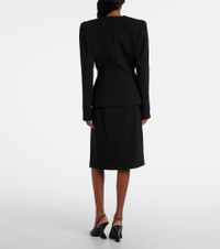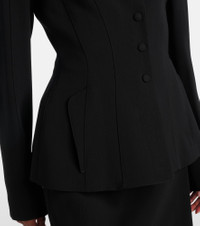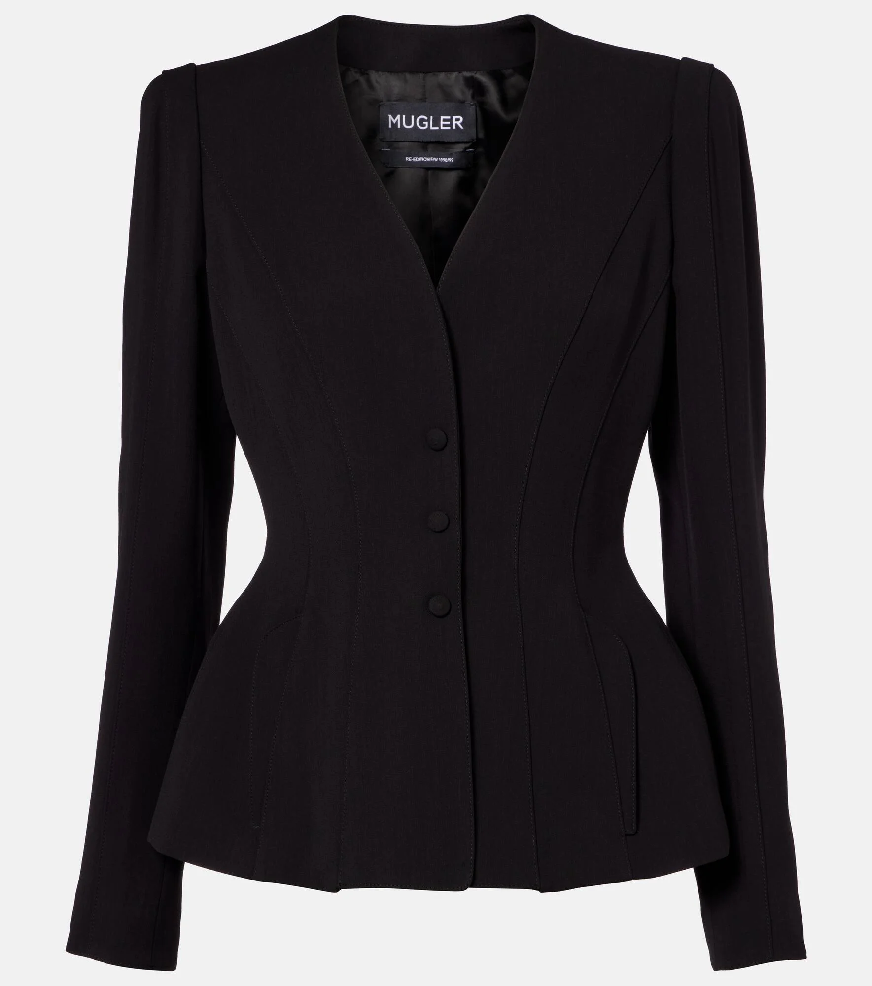 Mugler's re/edit capsule offers a reinterpretation of the house's signature archival pieces. Precisely tailored from a heavy suiting fabric, this blazer features a collarless silhouette, padded shoulders, and a fitted waist. Product Details - Material: 78% viscose, 22% wool - Care instructions: dry clean - Made in Ukraine - Designer color name: Black - Item color: black - Lining: 100% cupro - Pockets: side slit pockets - Closure: single-breasted (three buttons) - Item number: P01104869 Size & Fit - True to size - Shoulder pad inserts - Cinched waist - Non-stretchy fabric - Falls to the hip - The model seen in the picture is 178cm-5'10" and wearing a size FR 36