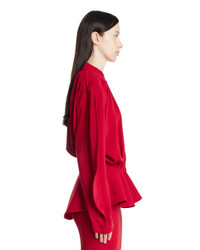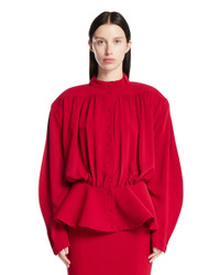 Mugler Red Re/edit Peplum Top. Red technical fabric, mandarin collar, dropped shoulders, wide long sleeves, front closure with tone-on-tone covered buttons. Draped details and an asymmetric peplum-style hem. Janne is 179 cm and she is wearing size 36. DETAILS Model: COM1TO08345773034 Composition: 51% Recycled Polyester, 49% Polyester Made in: BULGARIA Season: FW25-26