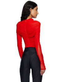 Semi-sheer stretch recycled nylon mesh bodysuit. Ruching throughout. · Round neck · Central seam at front · Concealed zip closure at back collar · Press-stud fastening at bottom · Partial stretch cotton jersey lining Supplier color: Red Body: 94% recycled polyamide, 6% elastane. Lining: 89% cotton, 11% elastane. Made in Tunisia 251345F358013
