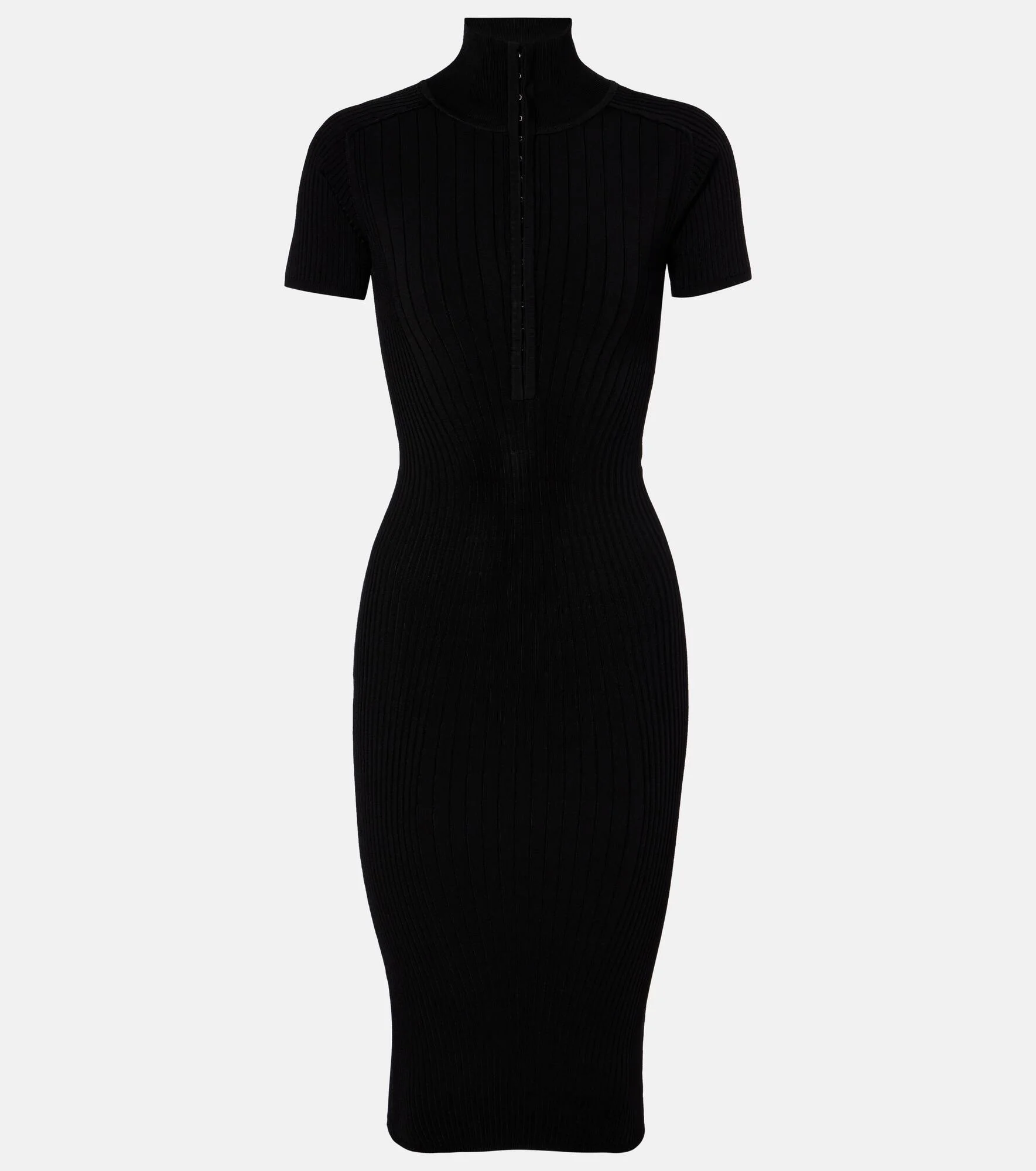 Best known for its sculptural silhouettes, the Parisian house of Mugler challenges conventional fashion design. This midi dress features a fitted turtleneck silhouette and contouring, ribbed-knit detailing. Product Details - Material: 87% rayon, 11% nylon, 2% elastane - Care instructions: machine wash at 30 degrees - Made in China - Designer color name: Black - Item color: black - Sleeves: short-sleeved - Cuff: ribbed - Hem: ribbed - Closure: concealed closure, hook-fastening front - Item number: P01060866 Size & Fit - True to size - Close fit at the neck - Fitted - Stretchy fabric - The model seen in the picture is 178cm-5'10" and wearing a size XS