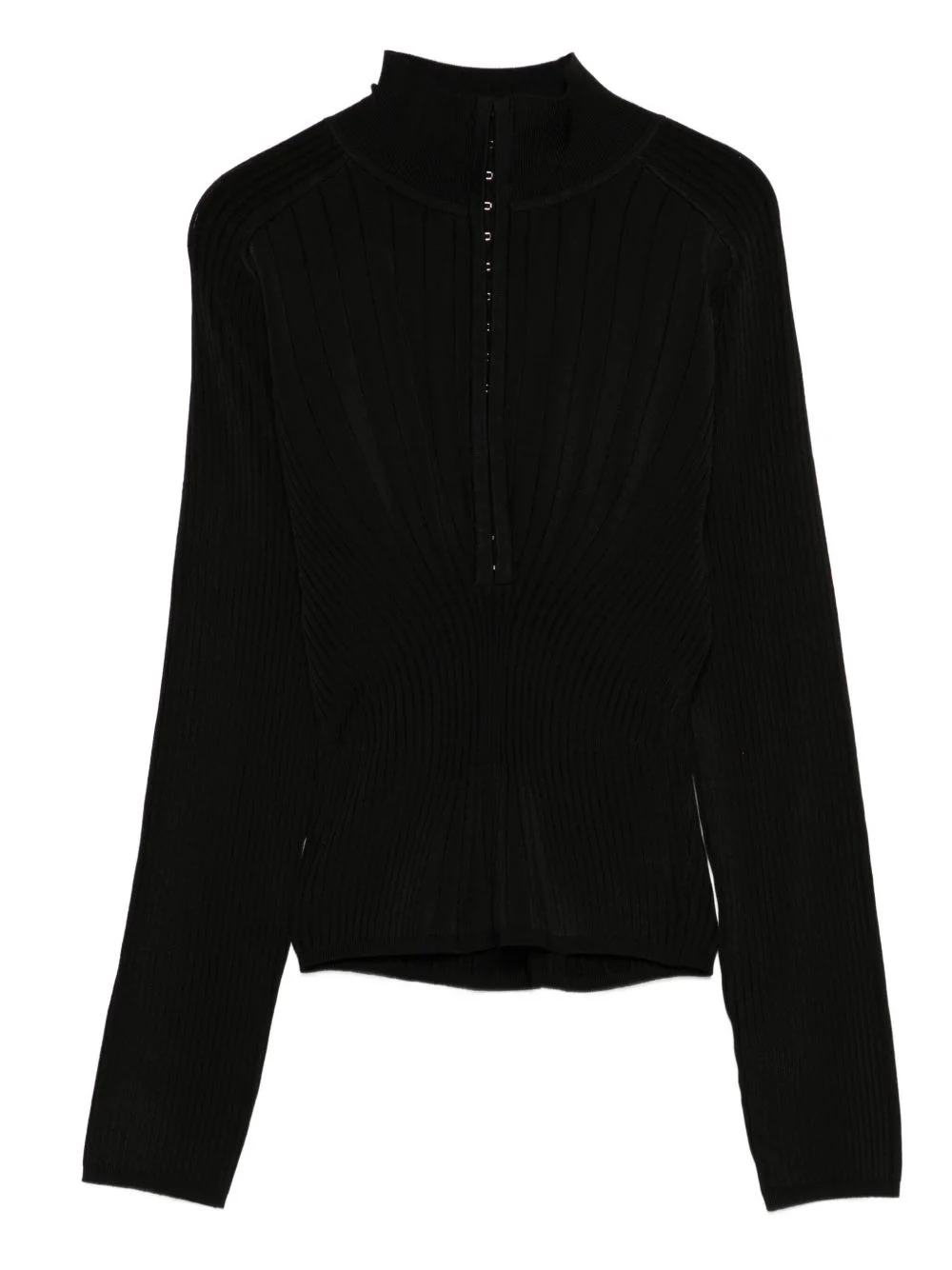 ribbed mock-neck sweater Highlights Imported Composition Rayon 87%, Recycled Nylon 11%, Elastane 2% SIZE & FIT Model measurements Height 5 ft 9 in(1.75 m) Bust/Chest 34.64 in(88 cm) Hips 36.61 in(93 cm) Waist 26.37 in(67 cm)