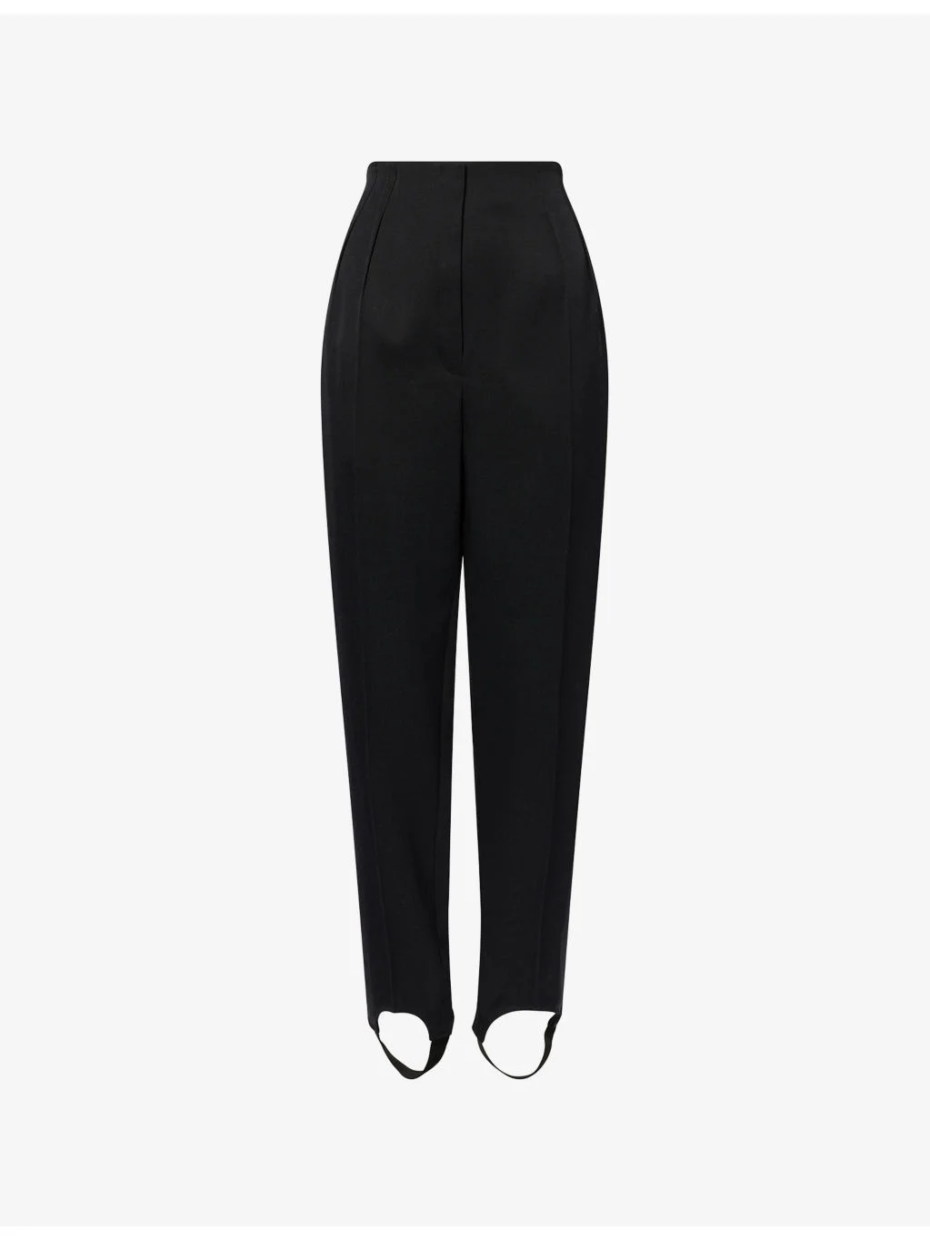 PRODUCT DETAILS - Mugler wool trousers - 100% wool - Button and zip-fly fastening - Regular fit, slim leg, high rise, pleated at waistband, welt pockets at sides, satin stripe at side seam, elasticated stirrups at ankle - Dry clean - True to size - Size UK 10: rise 14in / 35.0, inside leg 32in / 81cm, leg opening 13in / 33cm - Model is 5ft 10in / 1.78m and wears a size UK 10 - Midweight, non-stretch Ref: R04584372