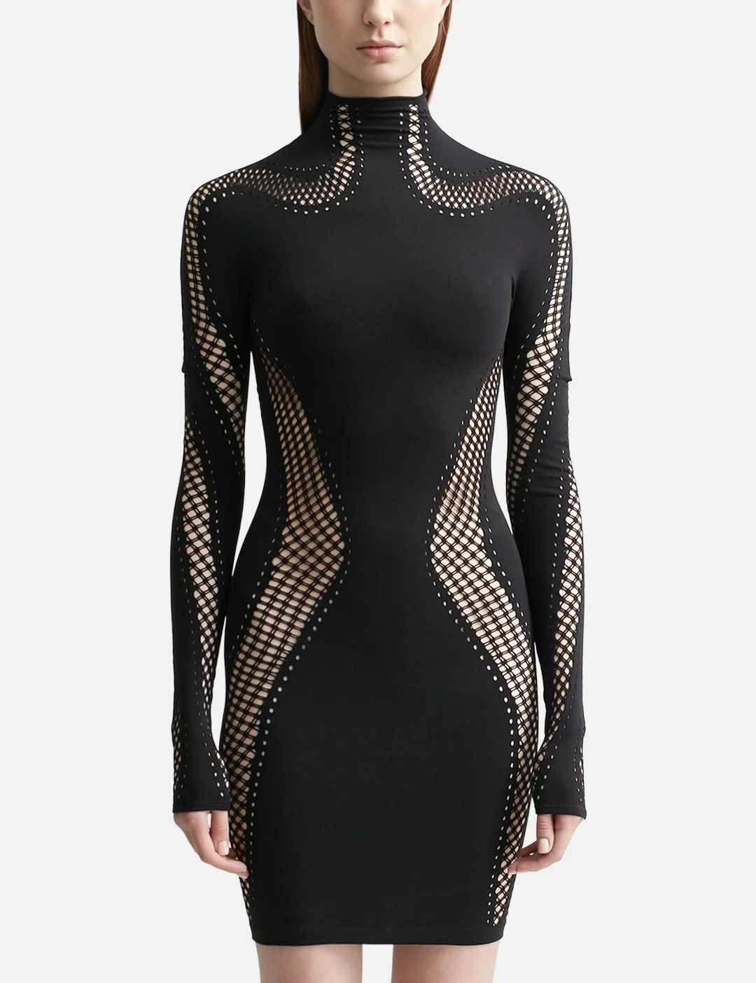 - Mugler - Seamless Day Dress - Mini length - Fitted - Mesh seethrough design - Turtleneck - Long sleeves - Signature star hardware at the rear neck - Color: Black - Material: 81% Nylon, 19% Spandex - See more Tops and Clothing - Model wears size 36 - Model measures: Height 181cm, Chest 33”/84cm, Waist 24”/61cm, Hip 35”/90cm - Vendor Code: #22W2RO14711106
