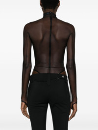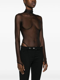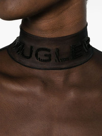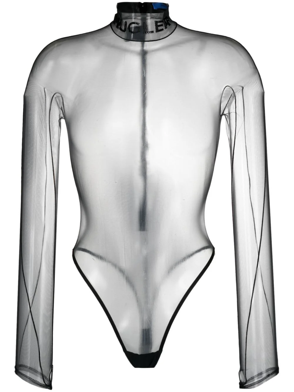 logo-embossed sheer bodysuit In keeping with Mugler’s daring visual identity, this black bodysuit is crafted from sheer tulle. It’s detailed with a flocked logo at the high neck. Highlights - Black - Tulle - Sheer - Logo-embossed at the neck - Mock neck - Concealed rear zip fastening - Branded zip puller - Press-stud fastening - Long sleeves - Thumb slots - Just a reminder that this piece must be tried on over your own garments. Imported Composition Outer: Polyamide 77%, Elastodiene 23% Lining: Cotton 100% SIZE & FIT Model measurements Height 5 ft 11 in(1.8 m) Bust/Chest 32.67 in(83 cm) Hips 36.22 in(92 cm) Waist 24.4 in(62 cm) FittingInformation Designed for a close fit throughout The sleeves are constructed with additional length and built-in thumb loops that allow for movement and a secure fit Made from a lightweight stretch fabric, this piece offers elasticity and flexibility when worn This piece fits true to size – take your usual size Measurement SLEEVE LENGTH 20.47 in(52 cm) BUST 23.62 in(60 cm) Washing instructions Machine Wash