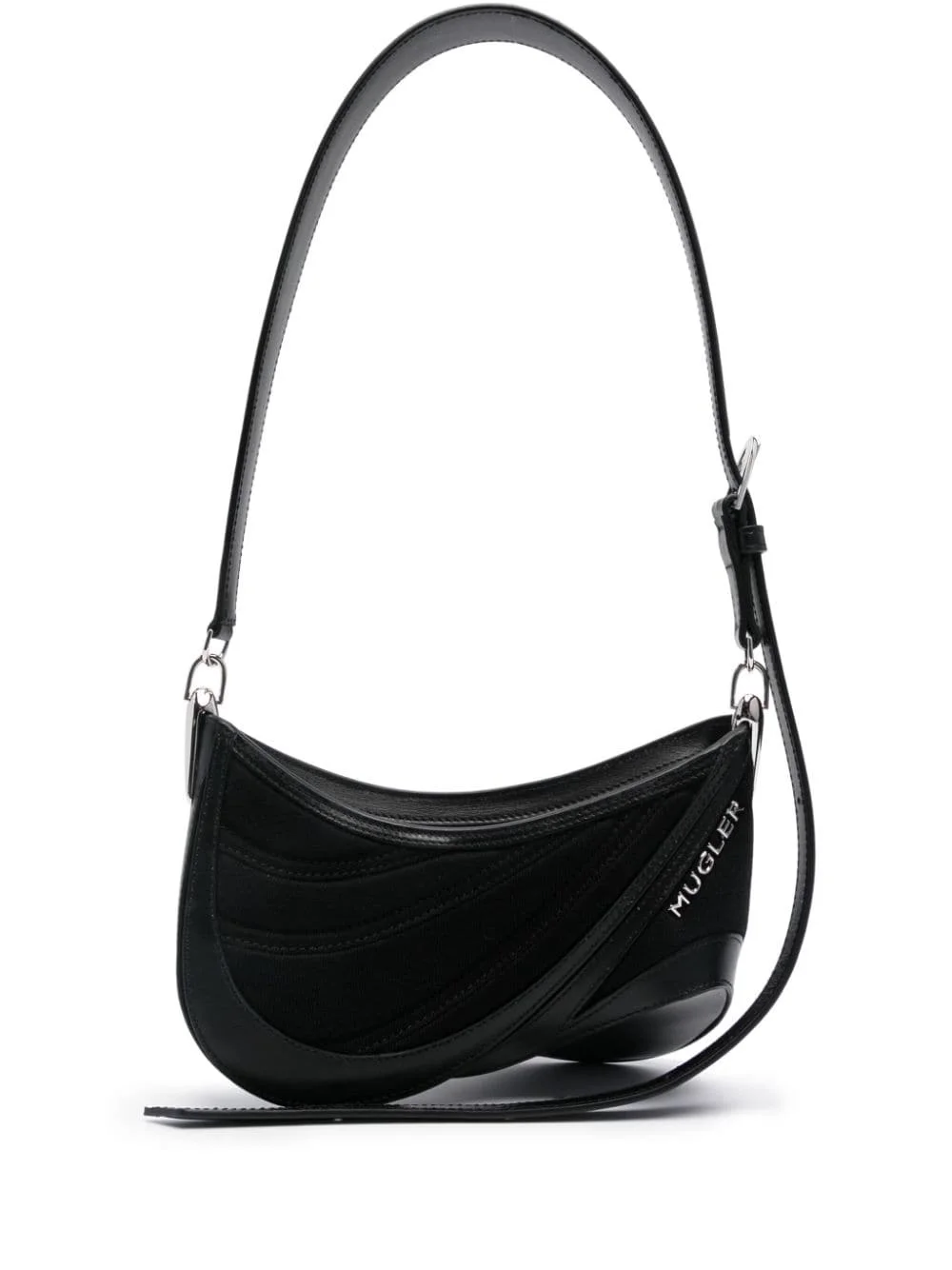 Spiral Curve 01 shoulder bag Mugler’s Spiral Curve 01 shoulder bag is named after its sculpted silhouette. It’s handcrafted in Italy from black leather and punctuated with an embossed panel. Polished silver-tone logo lettering traces the front. Highlights - Black - Cotton - Denim - Leather panel corners - Silver-tone logo lettering - Top zip fastening - Branded zip puller - Adjustable shoulder strap - Hard twisted body - Main compartment - Internal logo stamp - Internal slip pocket Made In Italy Composition Outer: Calf Leather 100%, Fabric 100% SIZE & FIT Model measurements Height 5 ft 9 in(1.76 m) Bust/Chest 33.07 in(84 cm) Hips 38.58 in(98 cm) Waist 24.8 in(63 cm) Measurement DEPTH 3.54 in(9 cm) HANDLE 17.71 in(45 cm) HEIGHT 6.29 in(16 cm) WIDTH 9.05 in(23 cm)