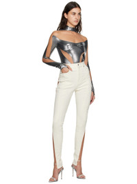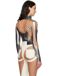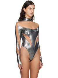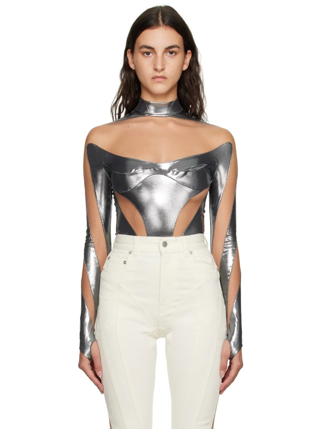 Semi-sheer stretch nylon jersey and tulle bodysuit. · Mock neck · Logo bonded at chest · Press-stud closure at bottom · Thumbhole at cuffs · Zip closure at back · Partial cotton jersey lining Supplier color: Chrome Body 1: 78% polyamide, 22% elastane. Body 2: 77% polyamide, 23% elastodiene. Lining: 100% cotton. Made in Portugal 232345F358070