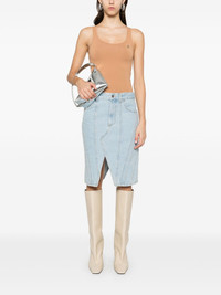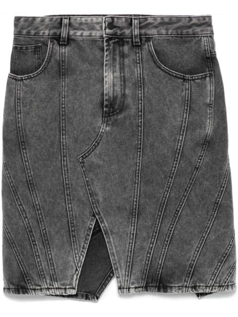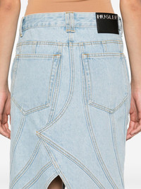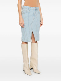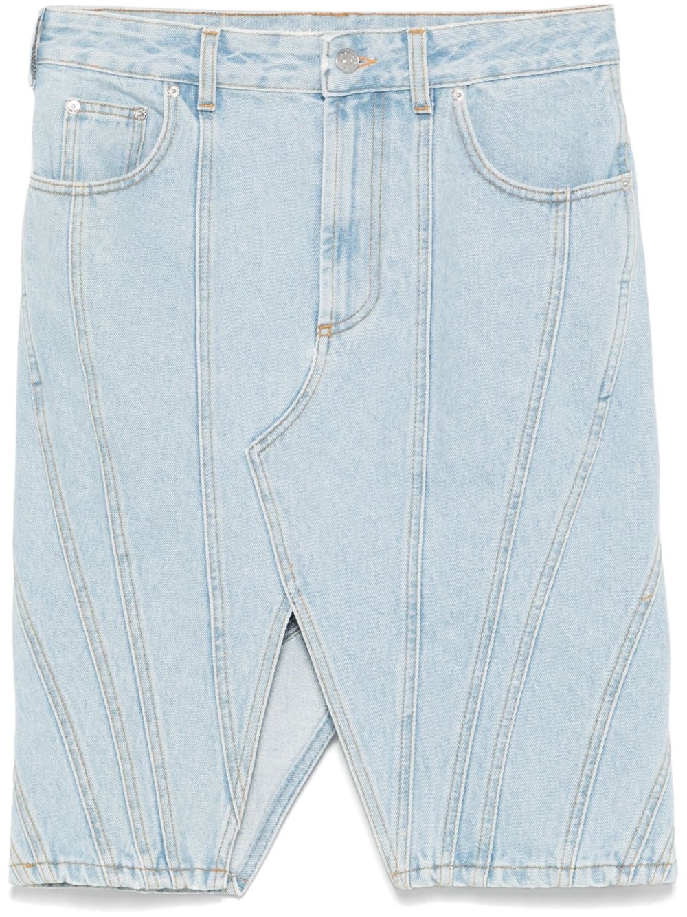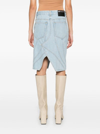 spiral denim skirt Highlights - Blue - Organic cotton - Washed denim - Panelled design - Asymmetric design - Concealed fly and button fastening - Low-rise - Contrast stitching - Belt loops - Classic five pockets - Front slit - Logo patch to the rear - Rear slit - Unlined - Straight hem - Knee-length Made in Italy Composition SIZE & FIT Model measurements Height 5 ft 10 in(1.78 m) Bust/Chest 33.85 in(86 cm) Hips 36.61 in(93 cm) Waist 25.19 in(64 cm) FittingInformation This midi-length skirt is intended to be worn low on the hips Sturdy and hard-wearing, this denim piece offers no stretch