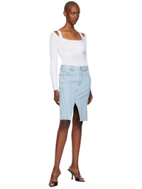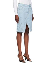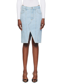 Non-stretch organic cotton denim midi skirt. Fading throughout. · Paneled and asymmetric construction · Low-rise · Belt loops · Five-pocket styling · Zip-fly · Offset vent at front and back hem · Leather logo patch at back waistband · Contrast stitching in yellow Supplier color: Medium blue 100% organic cotton. Made in Italy 242345F090001