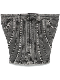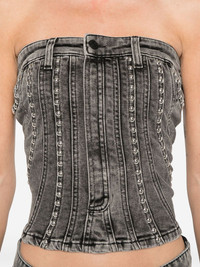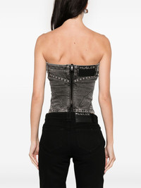 spiral denim studded bustier Highlights - Faded black - Cotton blend - Denim - Signature spiral effect - Stud detail - Bustier-style neckline - Front button fastening - Rear zip fastening - Strapless - Sleeveless - Straight hem Made in Italy Composition Cotton 98%, Elastodiene 2% SIZE & FIT Model measurements Height 5 ft 10 in(1.78 m) Bust/Chest 33.46 in(85 cm) Hips 36.22 in(92 cm) Waist 23.22 in(59 cm) FittingInformation Designed for a close fit throughout Constructed from stretch denim, this piece offers a stretch fit with durability