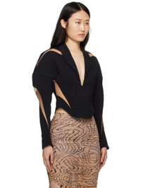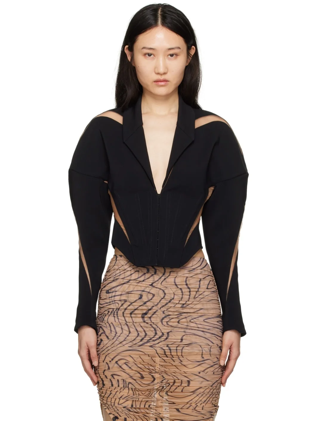 Semi-sheer viscose crepe and mesh blazer. Boning throughout. · Paneled construction · Plunging V-neck · Hook-eye closure · Zip vent at cuffs · Full twill lining Supplier color: Black/Beige Body 1: 96% viscose, 4% elastane. Body 2: 77% polyamide, 23% elastodiene. Lining: 57% viscose, 43% polyester. Made in Bulgaria 241345F057007