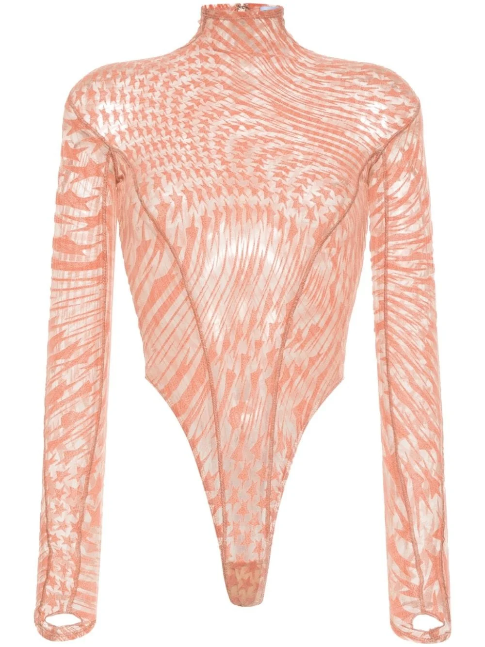 star-print mesh bodysuit Mugler's star motif was pinned as a hallmark for the house when a fortune teller saw its shape in Manfred Thierry Mugler's palm. A stretched iteration is rendered across this mesh bodysuit creating a warped appearance. Highlights - Peach pink - Stretch-design - Mesh detailing - Flocked finish - Star print - Tonal stitching - High cut - Mock neck - Concealed rear hook and zip fastening - Press-stud fastening - Long sleeves - Thumb slots - Just a reminder that this piece must be tried on over your own garments. Imported Composition Outer: Polyamide 94%, Elastane 6% Lining: Cotton 100% SIZE & FIT Model measurements Height 5 ft 11 in(1.8 m) Bust/Chest 31.49 in(80 cm) Hips 36.22 in(92 cm) Waist 25.59 in(65 cm) FittingInformation Designed for a close fit throughout The sleeves are constructed with additional length and built-in thumb loops that allow for movement and a secure fit Made from a lightweight stretch fabric, this piece offers elasticity and flexibility when worn This piece fits true to size – take your usual size