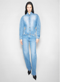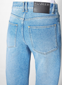 - high-waisted jeans in blue denim - Engraved metal button and fly closure - Belt loops - Five pockets with rivets - Straight leg with curved seams - Mugler patch on the back DETAILS MAIN FABRIC:100% COTTON made in ITALY style: 25F6PA0507211
