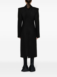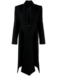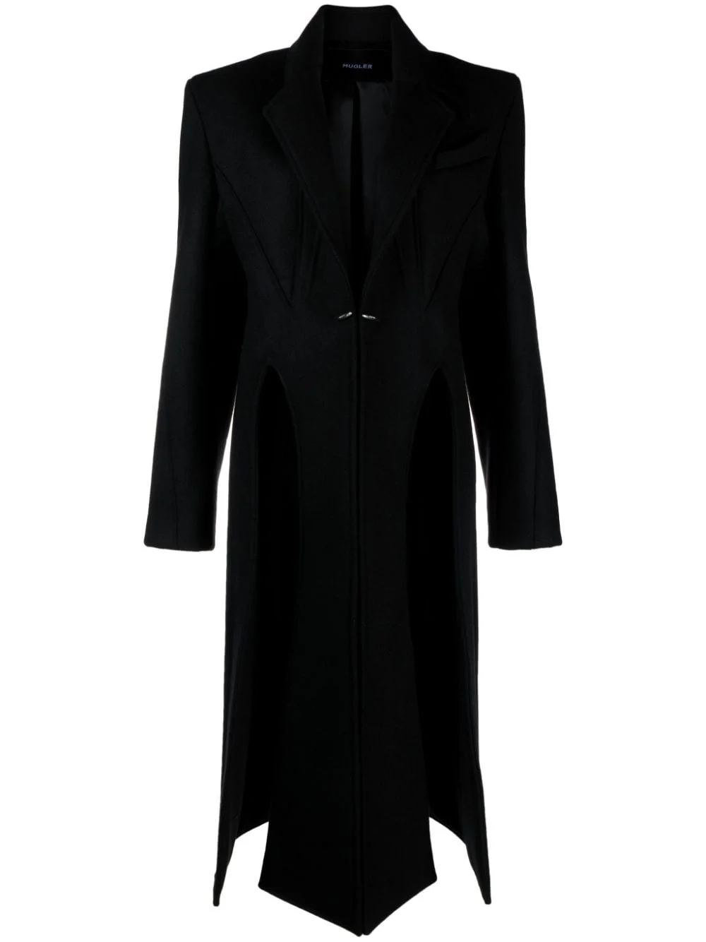 single-breasted wool coat Showing Mugler's innovative design, this single-breasted coat is enhanced with two front deep slits. Crafted from a wool blend, in black, it has a timeless design secured with a front hook fastening. Highlights - Black - Wool blend - Cut-out detailing - Notched lapels - Hook fastening - Long sleeves - Asymmetric hem Imported Composition Outer: Wool 80%, Polyamide 20% Lining: Cupro 100% SIZE & FIT Model measurements Height 5 ft 9 in(1.76 m) Bust/Chest 33.07 in(84 cm) Hips 34.64 in(88 cm) Waist 25.59 in(65 cm) Measurement CHEST 35.43 in(90 cm) SLEEVE LENGTH 27.55 in(70 cm) HIPS 40.94 in(104 cm) LENGTH 50.39 in(128 cm) WAIST 30.7 in(78 cm) FittingInformation Designed for a slim fit that sits just away from the body offering a close yet comfortable fit The internal shoulder pads offer a structured shape Made from a heavyweight non-stretch fabric This piece fits true to size – take your usual size Washing instructions Dry Clean Only