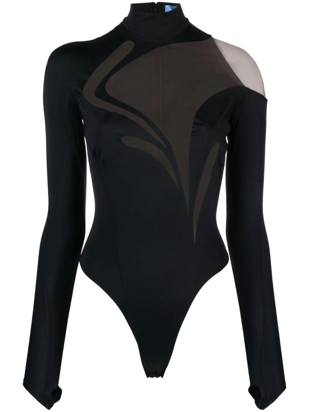sheer-panel panelled bodysuit Mugler is renowned for a panelled construction that creates an illusion, as seen with this bodysuit - sheer mesh panels at the bodice create a sculpted effect. Highlights - Black - Cotton - Stretch-design - Sheer panels - Mock neck - Long sleeves - Thumb slot - Just a reminder that this piece must be tried on over your own garments. Imported Composition Outer: Polyamide 78%, Spandex/Elastane 22% Lining: Cotton 100% SIZE & FIT Model measurements Height 5 ft 10 in(1.78 m) Bust/Chest 31.88 in(81 cm) Hips 36.61 in(93 cm) Waist 23.22 in(59 cm) FittingInformation Designed for a very close and sculpting fit The sleeves are constructed with additional length and built-in thumb loops that allow for movement and a secure fit Made from a midweight stretch fabric, this piece offers elasticity and flexibility when worn This piece fits true to size – take your usual size