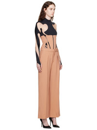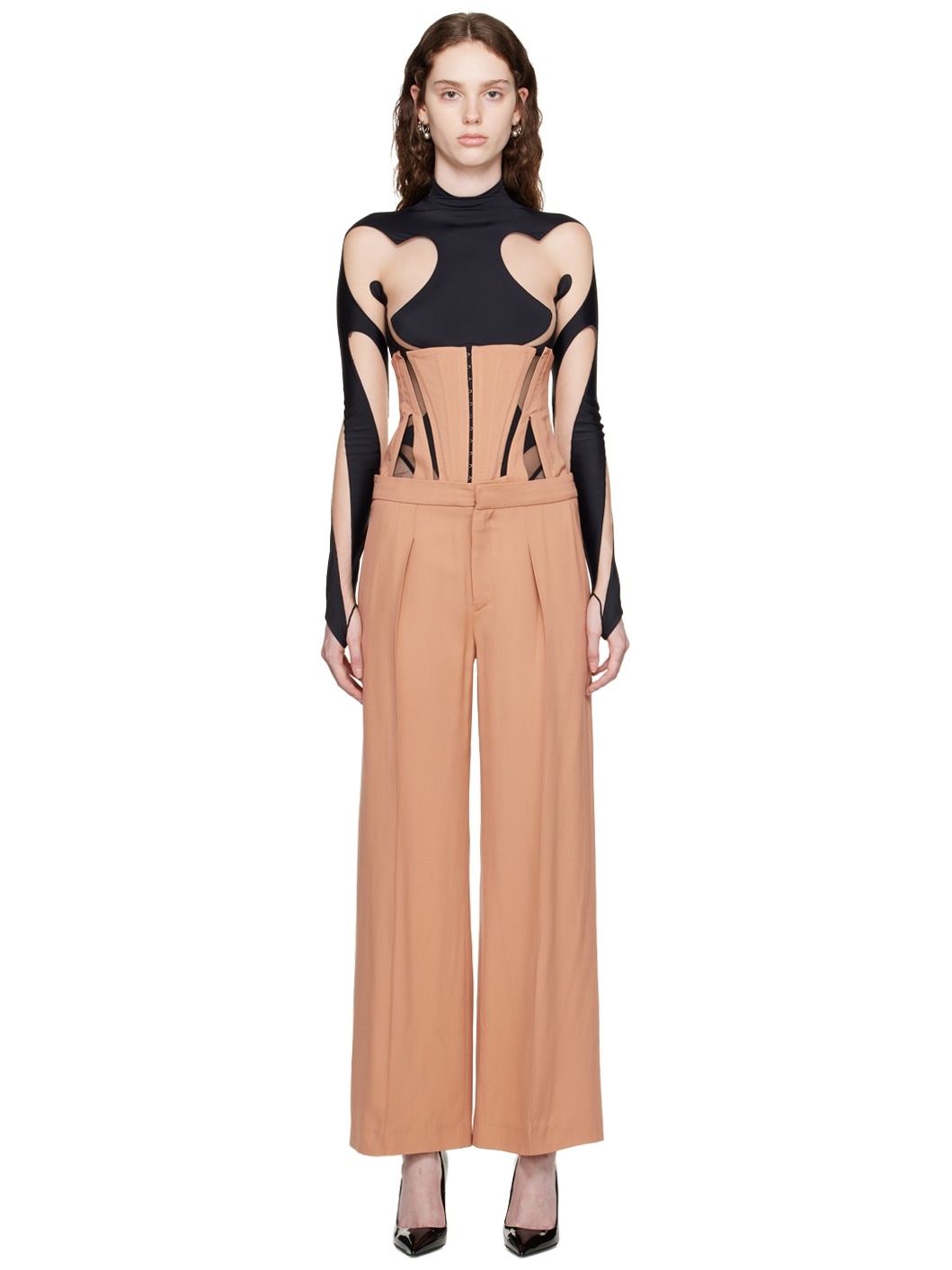 Viscose- and virgin wool-blend twill trousers. · Belt loops · Three-pocket styling · Zip-fly · Pleats at front · Pinched seams at front and back Viscose- and virgin wool-blend twill and stretch nylon tulle corset. Boning throughout. · Paneled construction · Hook-eye closure at front · Full cupro satin lining Supplier color: Porcini/Black