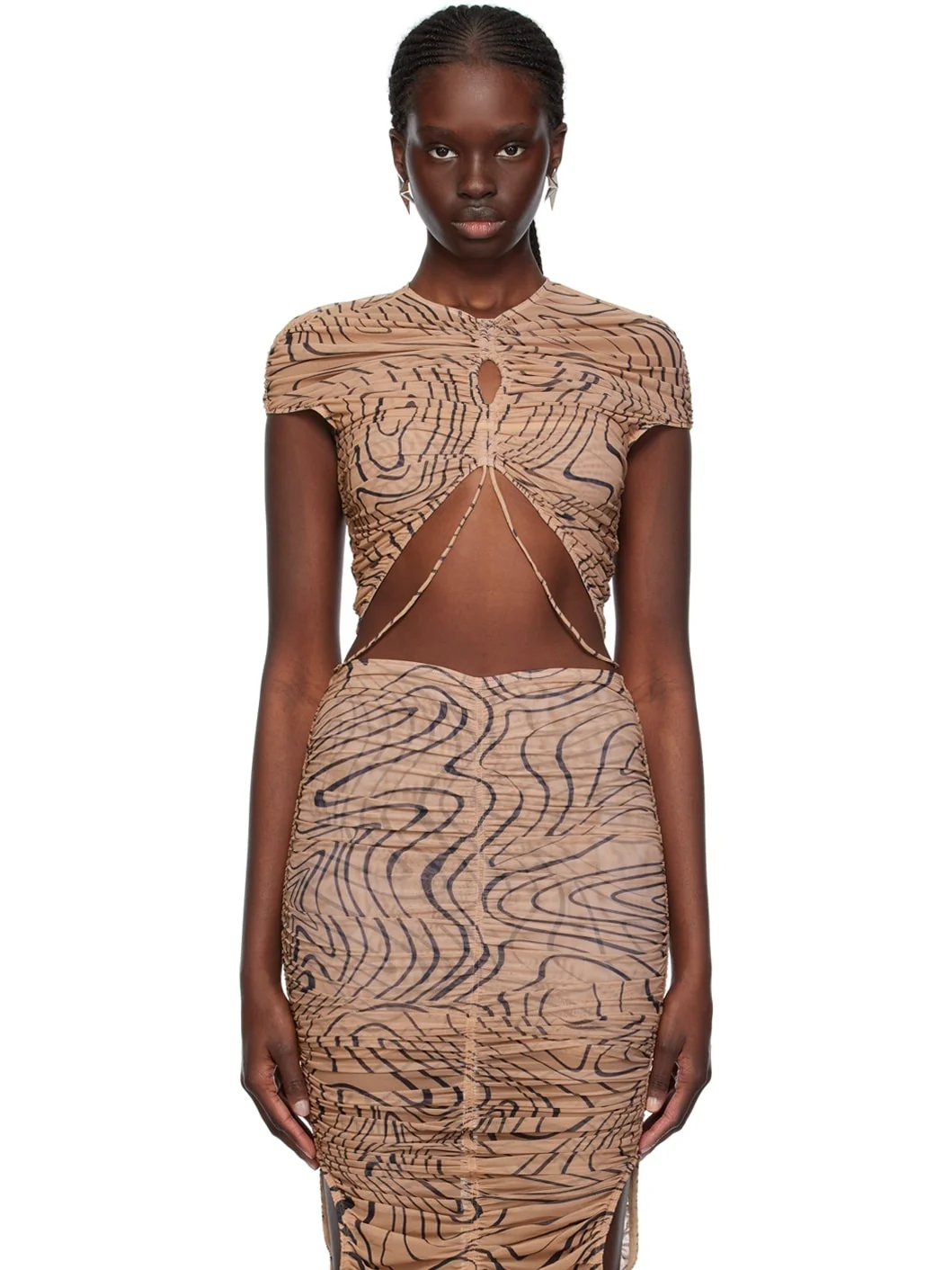 Semi-sheer stretch nylon mesh T-shirt. Ruching and graphic pattern printed throughout. · V-neck · Central seams at front and back · Cutout at chest · Cropped hem · Cap sleeves · Concealed zip closure at side seam Supplier color: Star print tan 94% polyamide, 6% elastane. Made in Portugal 241345F110011