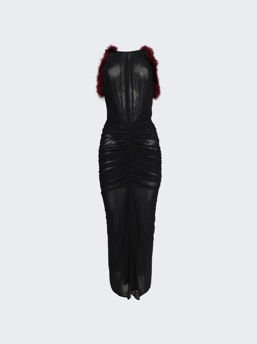 Details - Midi length - Fitted silhouette - Transparent mesh - Vertical and horizontally draped - Round neckline - Sleeveless with hand-sewn marabou feather trim - Gathered hip and box pleat - Diamond-shaped open back with keyhole closure - Care according to label - Material: 94% Recycle polyamide, 6% Elastane Size Information: Vendor Color Code: Brand Style: 25F3RO1783595 Designer/Brand: MUGLER
