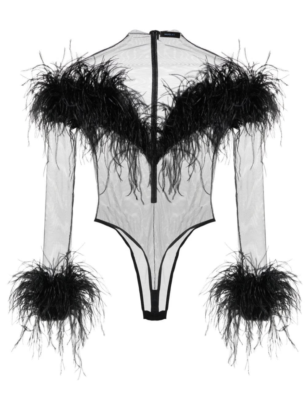 feather-trim mesh bodysuit This Mugler bodysuit is a testament to the brand’s provocative spirit. Made from sheer mesh, it is decorated with plumes of feathers around the bust and cuff sleeves for a touch of opulence. Highlights - Black - Stretch-design - Semi-sheer construction - Feather-trim detailing - Round neck - Long sleeves - Bottom press-stud fastening - Concealed rear zip fastening - Just a reminder that this piece must be tried on over your own garments. Imported Composition Ostrich Feather 100%, Cotton 95%, Polyamide 77%, Elastodiene 23%, Elastane 5% SIZE & FIT Model measurements Height 5 ft 11 in(1.8 m) Bust/Chest 30.7 in(78 cm) Hips 35.03 in(89 cm) Waist 24.4 in(62 cm) FittingInformation Designed for a close fit throughout Made from a lightweight stretch fabric, this piece offers elasticity and flexibility when worn This piece fits true to size – take your usual size Washing instructions Do Not Wash/Do Not Dry Clean