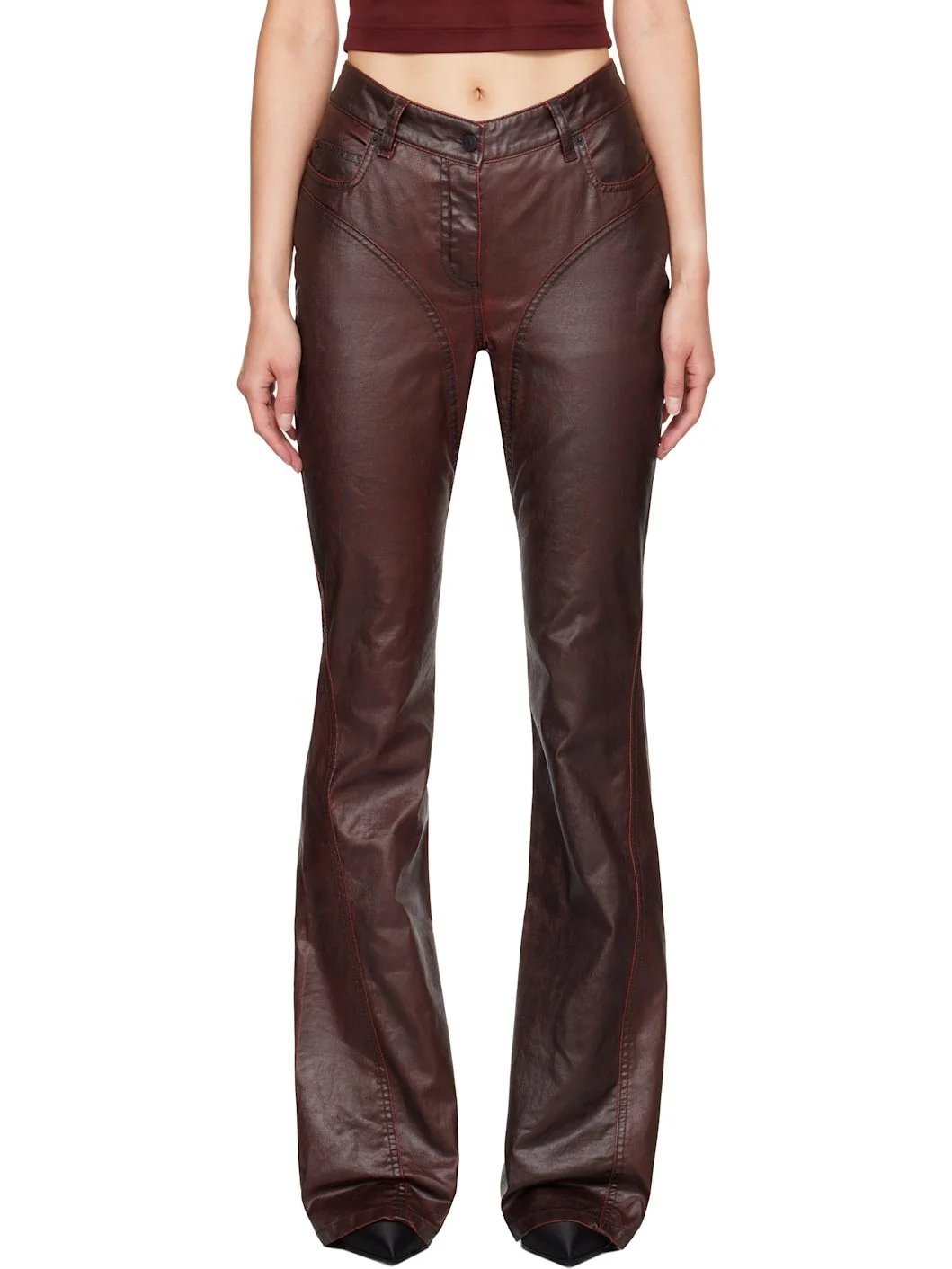 Flared waxed non-stretch denim jeans. · Paneled construction · Mid-rise · Belt loops · Five-pocket styling · Zip-fly · Logo patch at back waistband Supplier color: Vampire Body: 100% cotton resin. Lining: 65% polyester, 35% cotton. Made in Italy 242345F069012