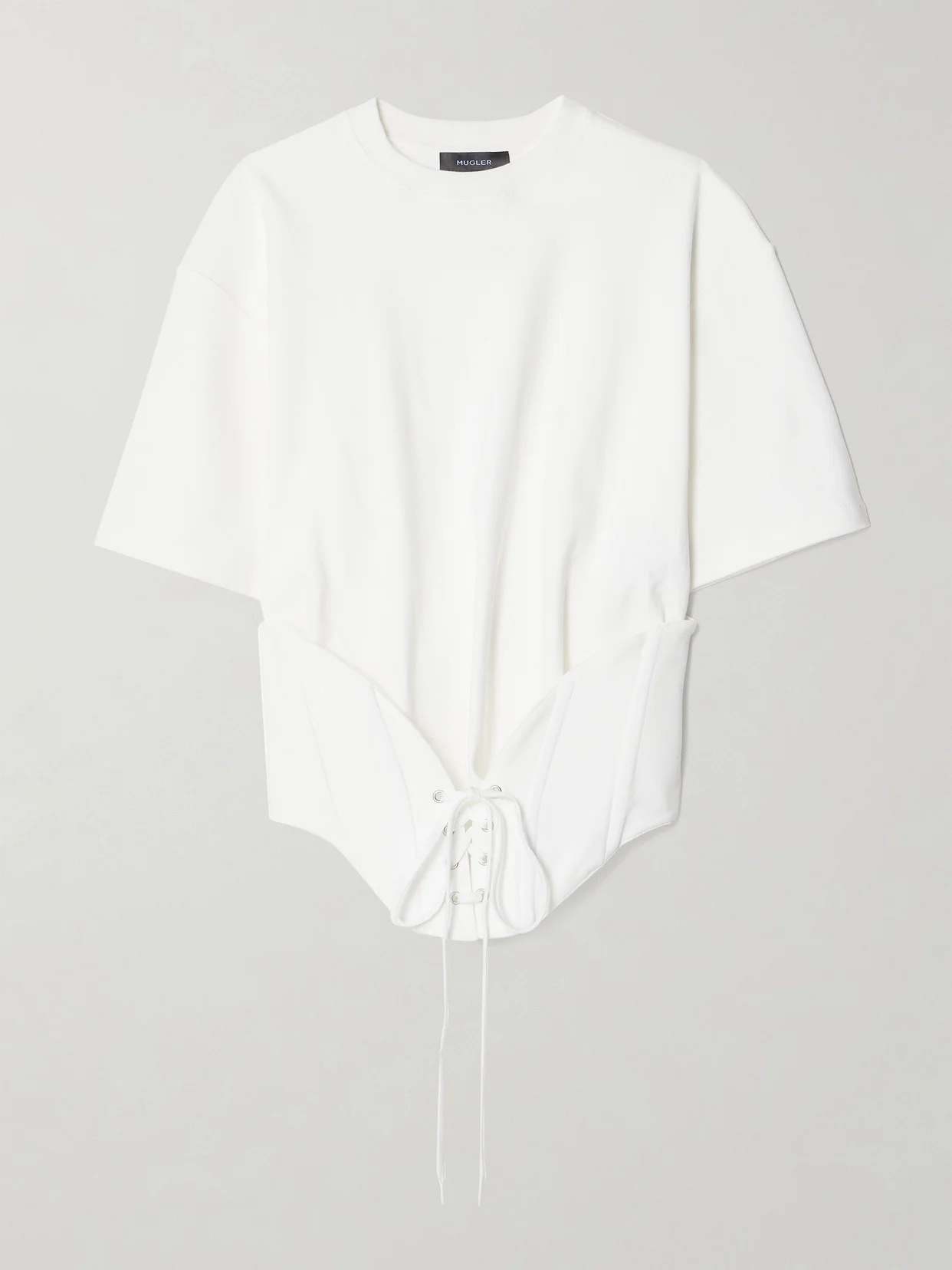 Mugler puts a feminine twist on this white T-shirt by cinching it with a boned stretch-crepe bustier at the waist. It's made from cotton-jersey and is threaded with laces to further accentuate your waist. Wear yours with the brand's signature leggings.