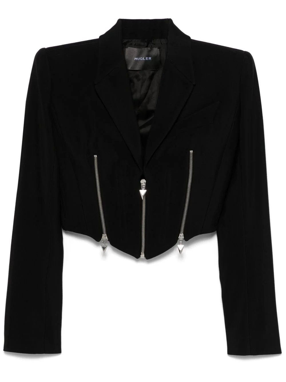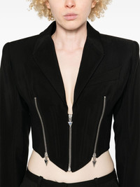 zip-up jacket Highlights - Black - Textured finish - Front zip fastening - V-neck - Notched lapels - Shoulder pads - Long sleeves - Buttoned cuffs - Zip details - Branded zip puller - Full lining - Curved hem - Cropped Imported Composition Lining: Cupro 100% Outer: Viscose 76%, Virgin Wool 24% SIZE & FIT Model measurements Height 5 ft 9 in(1.75 m) Bust/Chest 34.64 in(88 cm) Hips 36.61 in(93 cm) Waist 26.37 in(67 cm) FittingInformation Designed for a close fit throughout The internal shoulder pads offer a structured shape Made from a midweight non-stretch fabric