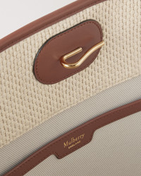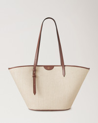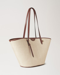 Life's a beach with our hand-crafted raffia style Basket Tote. This relaxed tote comes with an adjustable shoulder strap for multiple ways to wear. You bring the picnic, we've got the bag. Details A raffia-style woven tote bag. - Soft Gold hardware finish - Leather trim detailing - Foil embossed Mulberry signature - Adjustable shoulder straps with Poursin stud detailing - Herringbone lining Height 6¼" Width 21¾" Depth 6¼" Handle Drop 12¼" Material Raffia A soft raffia, woven in Italy using organic cotton and viscose fibres. This product's code is HH9796-000G110