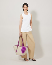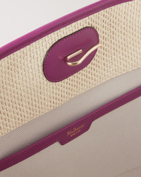 Life's a beach with our hand-crafted raffia style Basket Tote. Featuring a decorative, handmade Dahlia pom-pom and Poursin stud detailing, this tote comes with an adjustable shoulder strap for multiple ways to wear. You bring the picnic, we've got the bag. Details A raffia-style woven tote bag. - Soft Gold hardware finish - Decorative handmade Dahlia pom pom - Leather trim detailing - Foil embossed Mulberry signature - Adjustable shoulder straps with Poursin stud detailing - Herringbone lining Height 6¼" Width 21¾" Depth 6¼" Handle Drop 12¼" Material Raffia & Pom Poms A soft raffia, woven in Italy using organic cotton and viscose fibres. This product's code is HH9730-000J512