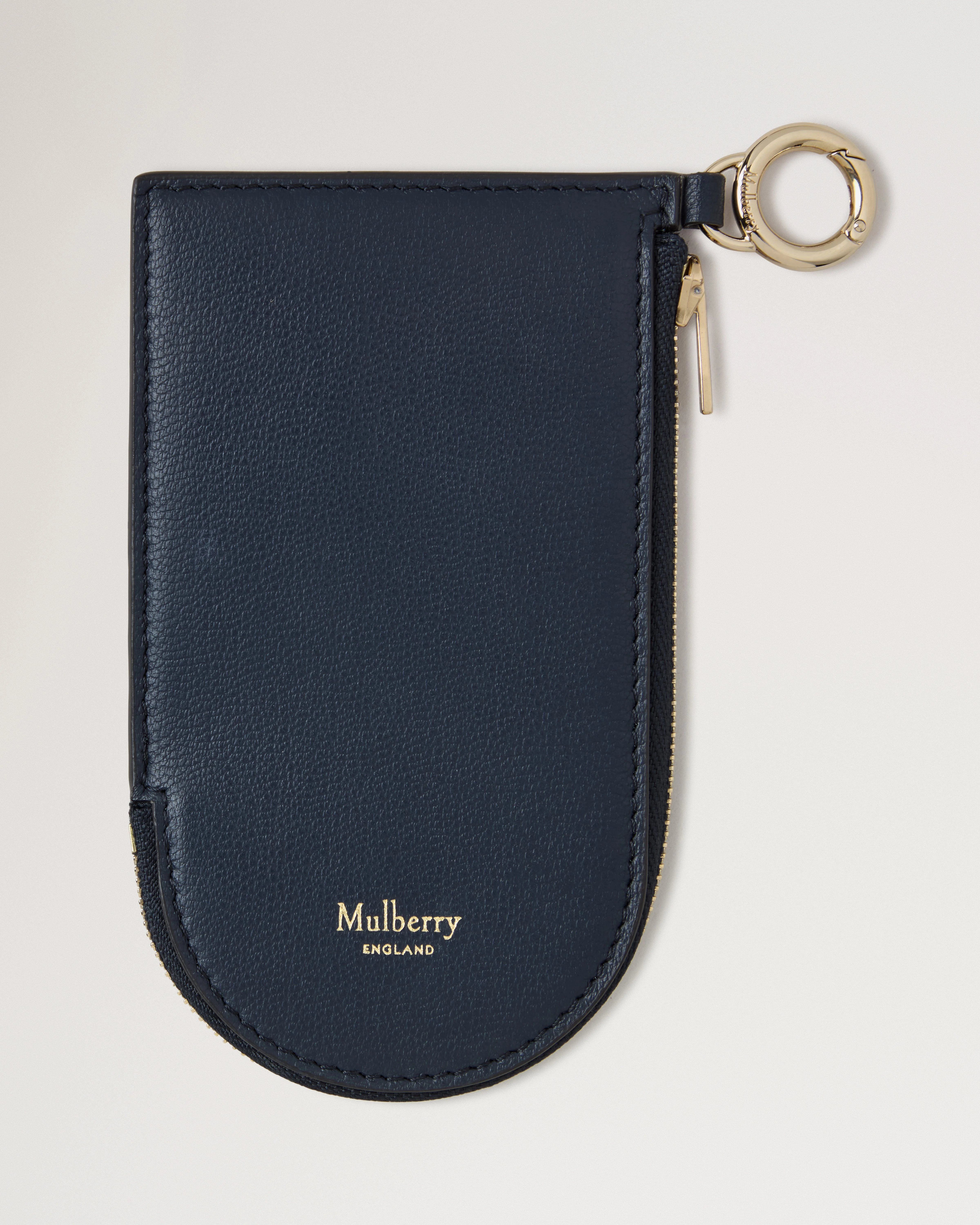 This Cardholder Keyring is the ultimate way to keep track of your cards. Attach to the Mulberry Lanyard and be sure you'll never lose your wallet again. Details A cardholder attachment for the Mulberry lanyard. - Soft Gold hardware finish - Foil embossed Mulberry signature - Foil embossed Mulberry Tree - One zipped compartment - Three card slip pockets - Snap hook attachment - Nappa and moire lining Height 5" Width 3¼" Material Micro Classic Grain A smooth calf leather with a micro grain and soft touch. This product's code is RL8809-587U888
