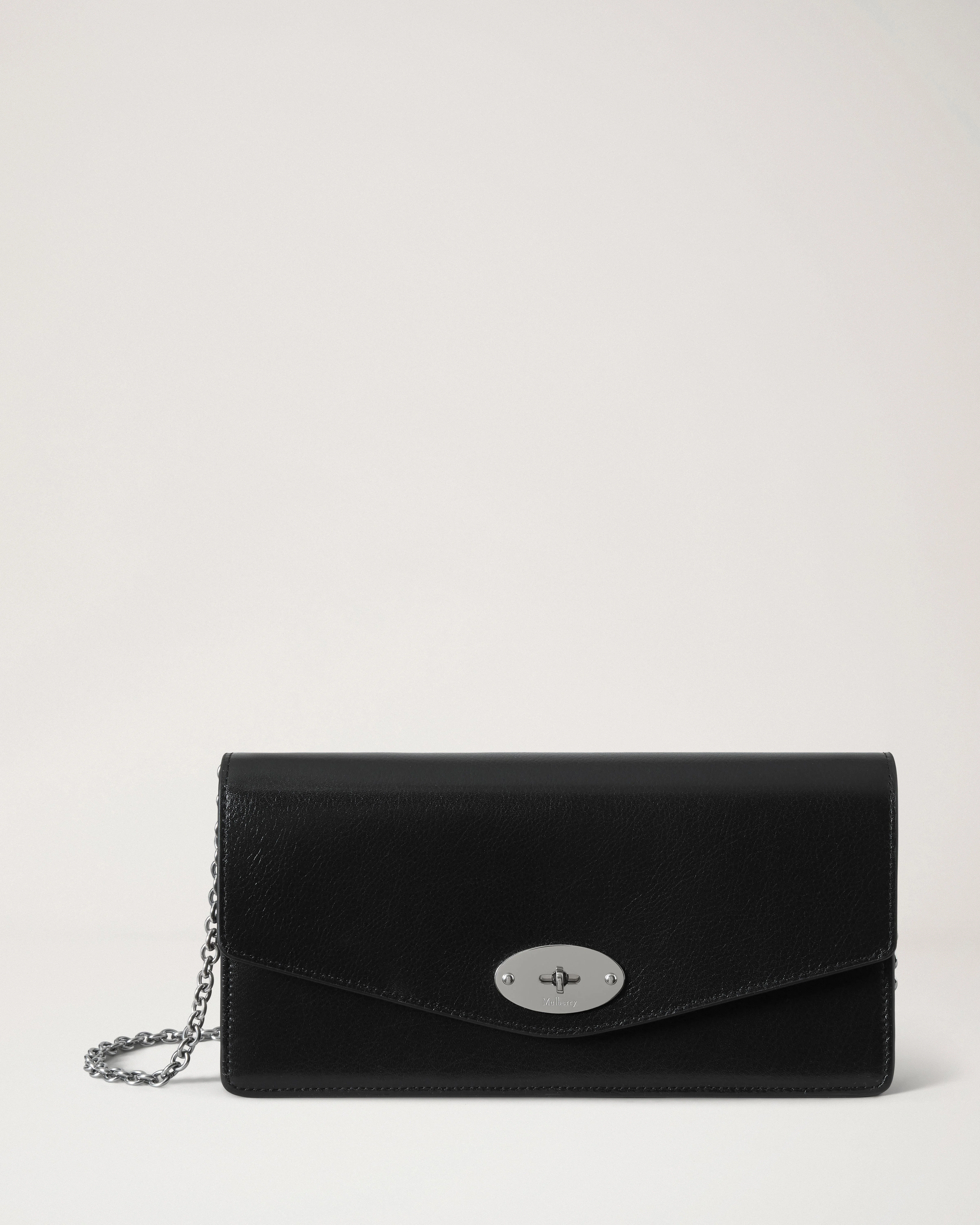 The only elegant evening bag you'll ever need. The Darley Clutch takes the iconic flap shape and lock from the original bag, and elongates it in an East West style. Perfect for drinks, dinner – or perhaps announcing yourself to the world in a debutante ball. Details An East West clutch bag. - Silver hardware finish - Postman's Lock closure - Six internal card slip pockets - One internal slip pocket - One internal zip pocket - Detachable chain strap for multi-wear functionality - Moire lining Height 5" Width 9¾" Depth 1¼" - 1½" Chain length 46" Strap drop 22" Shortened strap drop 6¾" Material High Shine Leather A smooth bovine leather that has been polished to achieve a high gloss finish. This product's code is RL9060-748A100