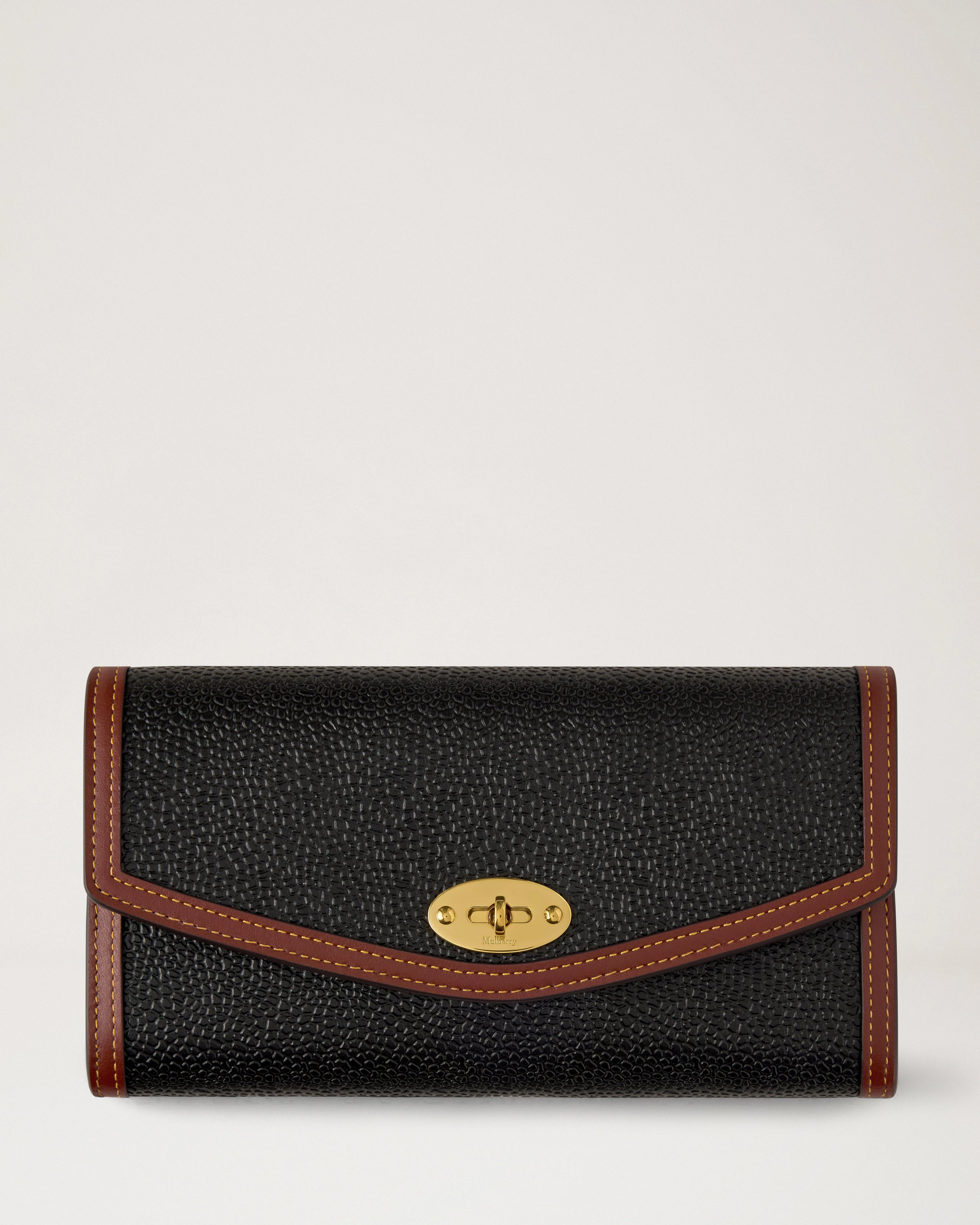 The Darley Wallet is a statement Mulberry accessory, combining our iconic Postman's Lock hardware with carefully considered detailing. Details A statement wallet with Postman's Lock detailing. - Brass hardware finish - Postman's Lock closure - Two gusseted compartments - Twelve credit card slip pockets - One internal zip compartment - Two internal slip pockets - One external card slip pocket - Nappa and moire lining Height 4" Width 7½" Depth 1" Material Bio-Based Scotchgrain This product features a heritage Mulberry material, Scotchgrain, which is durable, lightweight, made from recombined bio-based and recycled materials, and embossed with a distinctive pebble grain finish. The product is trimmed with a calf leather that has a very fine grain and a soft silky touch. This product's code is RL8991-127A340