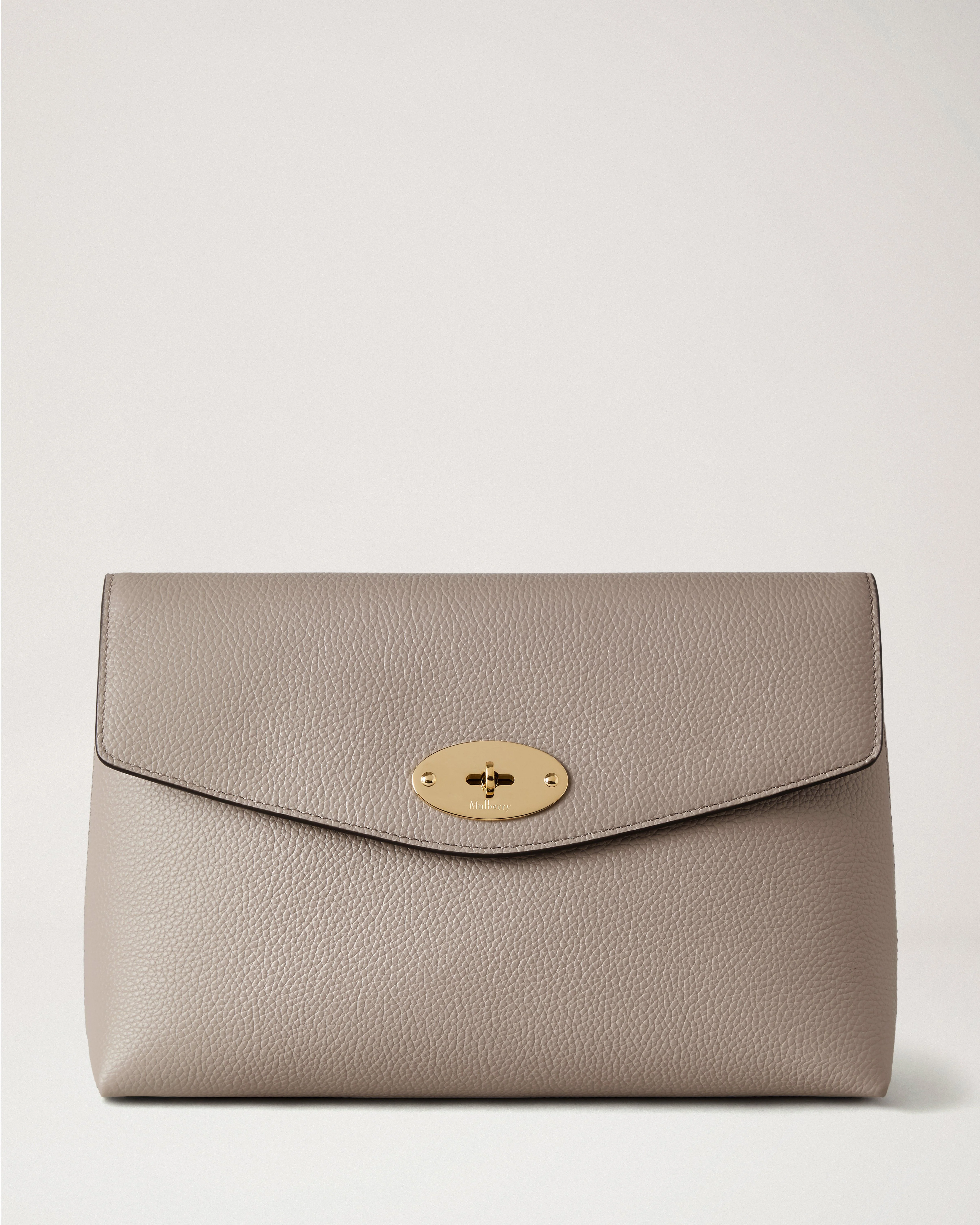 Our classic style gets a whole lot bigger. The Large Darley Cosmetic Pouch is perfectly sized to hold all the essentials. Details A large cosmetic pouch finished with Postman's Lock. - Top flap with Postman's Lock closure - Internal foil embossed Mulberry signature - One main compartment - Soft Gold hardware finish - PU lining Height 7½" Width 12¼" Depth 3½" Material Small Classic Grain A soft cow leather with a small printed grain effect. The leather is lightly finished to protect the grain surface. This product's code is RL8849-205F924