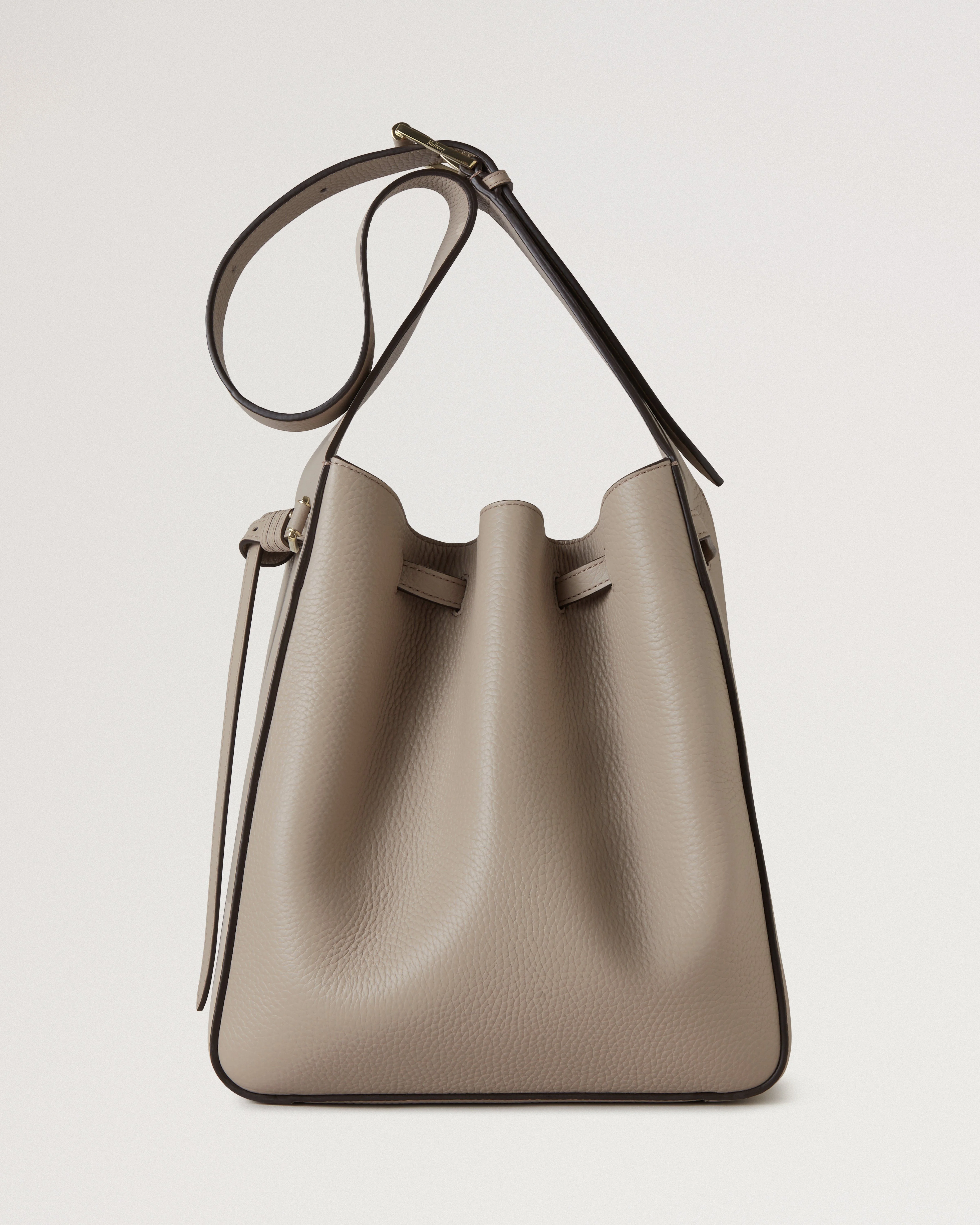 Embrace the understated everyday with our Lyra Bucket, a timeless, minimal style featuring an elegant three belt loop detailing. Designed to be worn as a tote or over the shoulder, the Lyra Bucket is the perfect piece to get you around town. Details A minimal, belted bucket bag. - Soft Gold hardware finish - Adjustable shoulder strap - Adjustable signature Lyra belt detailing - Internal detachable pouch with zip closure - Internal popper closure - Suitable for use with most laptops and iPads - Foil embossed Mulberry signature - Microsuede lining Height 11½" Width 11" Depth 6" Strap length 32¼" Material Heavy Grain A soft heavy bovine leather with a beautiful soft and supple hand feel. The surface will gradually become even softer with use adding to the beauty of the leather. This product's code is HH9743-736F924
