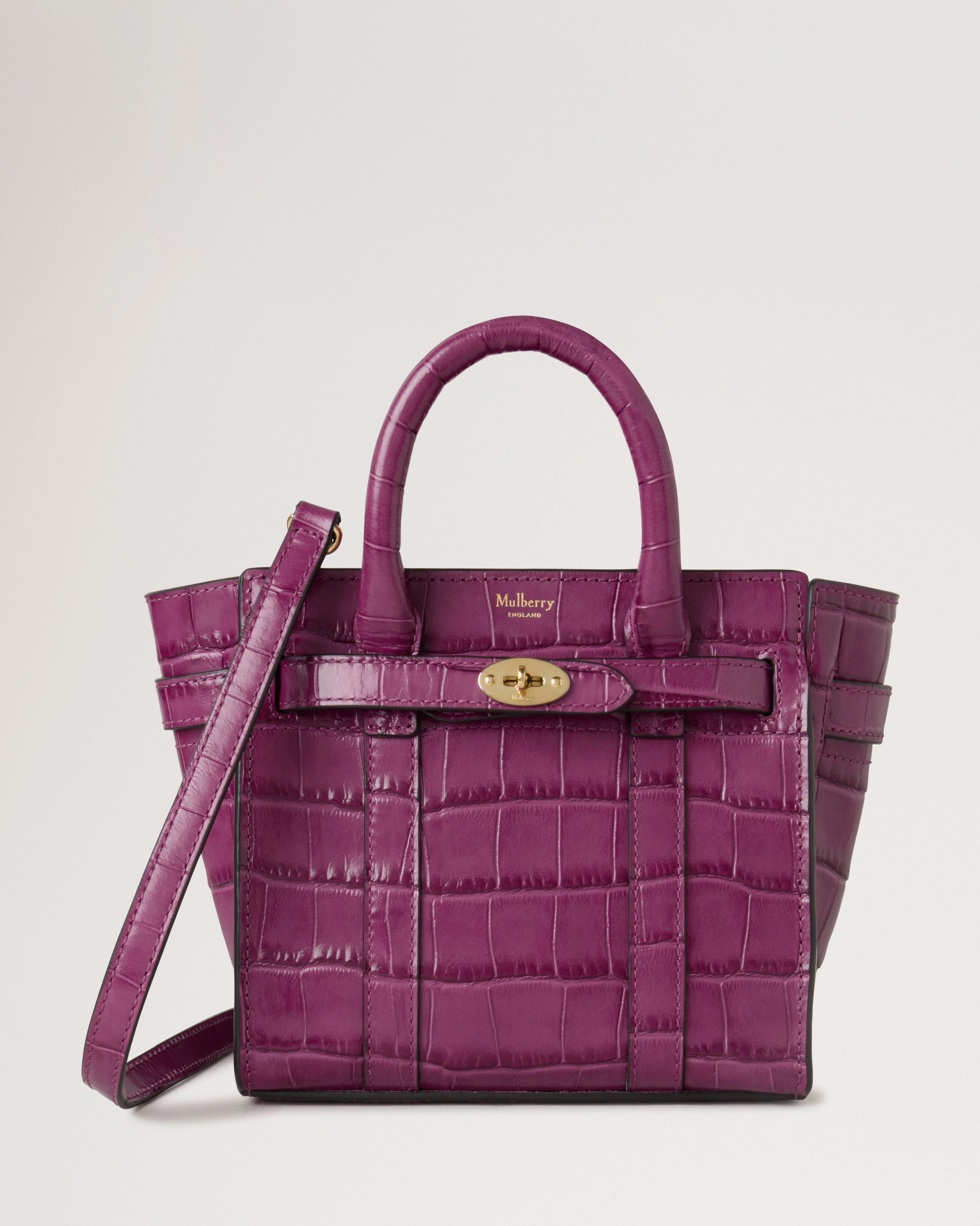 The Micro Zipped Bayswater has all the signatures of its family, including a minuscule version of our iconic Postman's Lock. Tiny in size but still practical in function, it features internal credit card slip pockets to keep essentials secure and an adjustable shoulder strap that can be removed as desired. Details A micro bag with zipped closure and shoulder strap. - Two structured top handles - Soft Gold hardware finish - Adjustable and detachable shoulder strap - Postman's Lock closure - Suede lining - Three internal credit card slip pockets - Foil embossed Mulberry logo Height 6¼" Width 6¾" Depth 4¼" Shoulder strap length Min 19¾" – Max 22½" Weight ¼kg, approximately Material Shiny Small Croc A high-shine cow leather with an embossed croc pattern. This product's code is RL8691-641J512