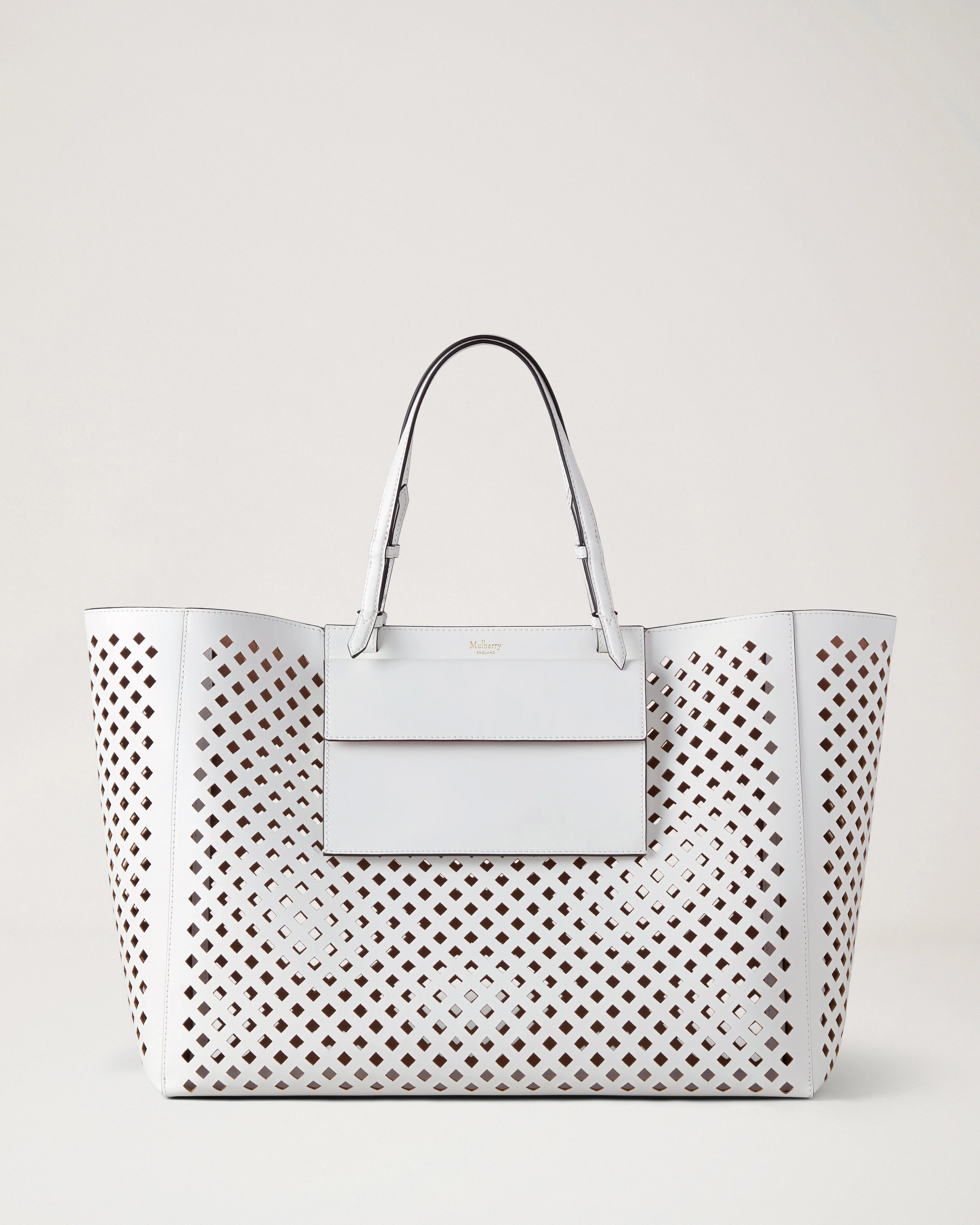 Inspired by the Great British greenhouse, and featuring an intricate knife-cut latticed pattern demonstrating the exquisite leathercraft of our artisans, this XL Perforated Tote is the perfect style for the summer months – and is designed for a life on the go. Details An extra-large, perforated, lattice-patterned leather tote bag. - Soft Gold hardware finish - Adjustable handles - Internal hook closure - Detachable pouch with press stud closure Height 13¾" Depth 7¾" Material Perforated Leather A knife-cut bovine leather with a resin-backed finish. This product's code is HH9729-709W100