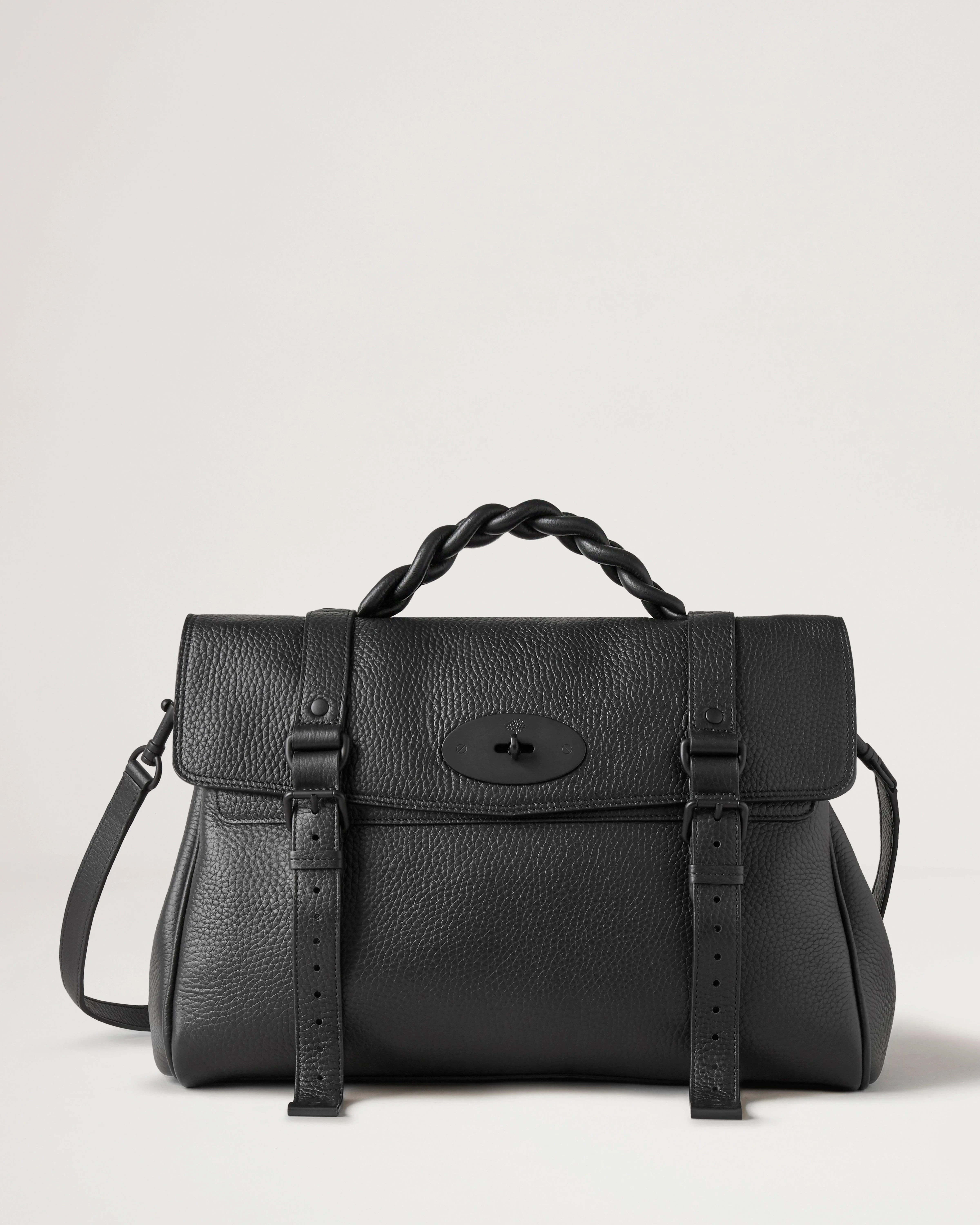 The Oversized Alexa effortlessly combines elements from two iconic Mulberry styles: the Bayswater bag and the Elkington briefcase. The result is a oversized version of an understatedly cool satchel complete with the signature Mulberry Postman’s Lock and belt buckle and strap hardware. Carry by the plaited leather top handle or wear with the adjustable cross body strap. Details An oversized version of the cult bag that epitomises laidback luxury. - Postman’s Lock closure - Handcrafted braided top handle - Adjustable leather shoulder strap for crossbody wear - One main compartment - Internal slip pocket - Matte black component finish - Unlined Height 12½" Width 14½" Depth 6¾" Shoulder strap length 41" Handle Drop 2¼" Weight ½kg, approximately Material Heavy Grain A soft heavy bovine leather with a beautiful soft and supple hand feel. The surface will gradually become even softer with use adding to the beauty of the leather. This product's code is HH6884-736A100