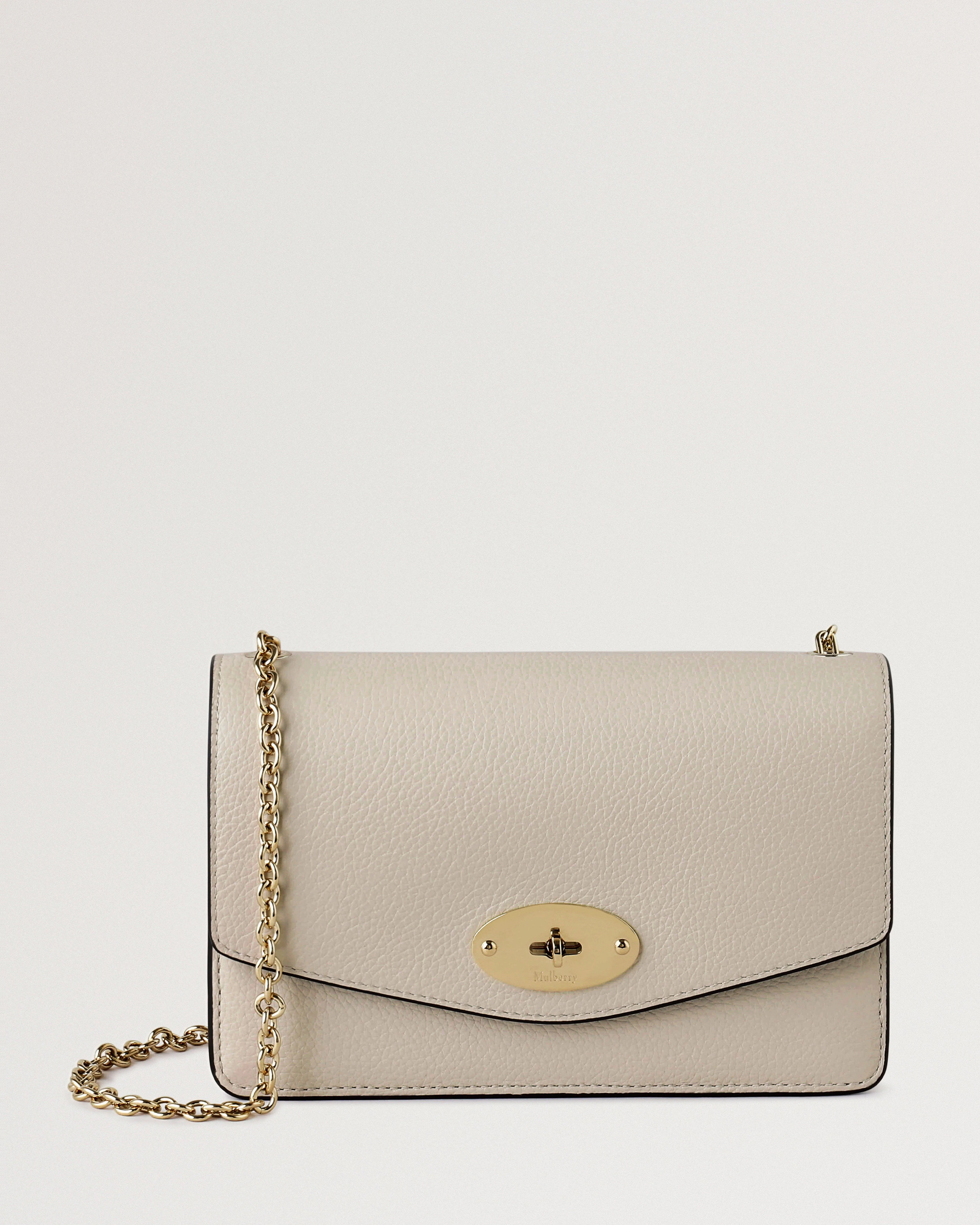 The Small Darley is a classic bag that celebrates our iconic Postman’s Lock. It’s perfect for carrying essentials or keeping valuables secure inside a large tote. Its elegant envelope silhouette can even be transformed into a clutch due to its detachable chain strap. Details The Small Darley can be worn across the body, over the shoulder, or carried as a clutch. - Postman's Lock closure - Detachable chain and leather strap - One main compartment - Eight credit card slip pockets - One internal zip compartment - Two internal slip pockets - One external zip pocket with gusset - Soft Gold hardware finish - Nappa lining Height 5" Width 7½" Depth 1¾" Shoulder strap drop 22" Weight ¼kg, approximately Material Small Classic Grain A soft cow leather with a small printed grain effect. The leather is lightly finished to protect the grain surface. This product's code is RL7791-205W160