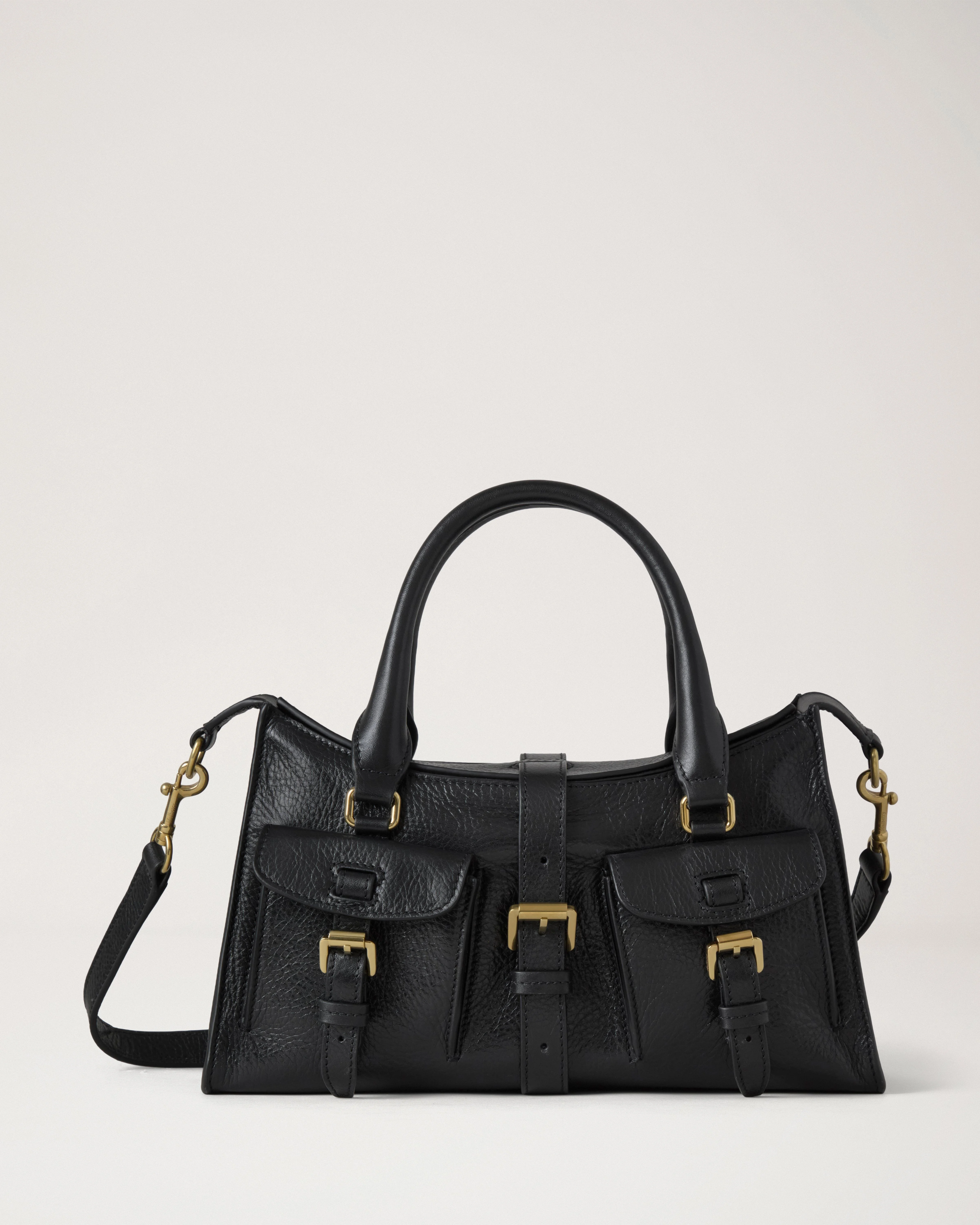 A small version of our Roxanne bag, itself a modern update on our 2004 style, the Small Roxanne takes all the Y2K attitude of the original and updates it, with brass buckling and streamlined details. Features two front pockets ideal for smaller items, as well as a detachable and adjustable strap for multiple ways of wearing. Details A Small version of our Y2K-inspired Roxanne style. - Brass hardware finish - Detachable and adjustable strap - Two top handles - Two external front pockets with magnetic closure - One internal slip pocket - Buckle detailing - Foil embossed Mulberry signature - Mulberry Heritage Check lining Height 5¼" - 6¾" Width 9½" - 11" Depth 2¼" - 4" Handle Drop 4¾" Strap Length 27¼" - 33" Strap Drop (from middle hole) 19¾" Weight ¼kg, approximately Material High Shine Leather A bovine leather with a natural grain and high shine finish. This product's code is HH9977-213A100