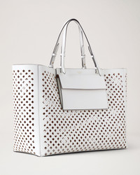 Inspired by the Great British greenhouse, and featuring an intricate knife-cut latticed pattern demonstrating the exquisite leathercraft of our artisans, this XL Perforated Tote is the perfect style for the summer months – and is designed for a life on the go. Details An extra-large, perforated, lattice-patterned leather tote bag. - Soft Gold hardware finish - Adjustable handles - Internal hook closure - Detachable pouch with press stud closure Height 13¾" Depth 7¾" Material Perforated Leather A knife-cut bovine leather with a resin-backed finish. This product's code is HH9729-709W100