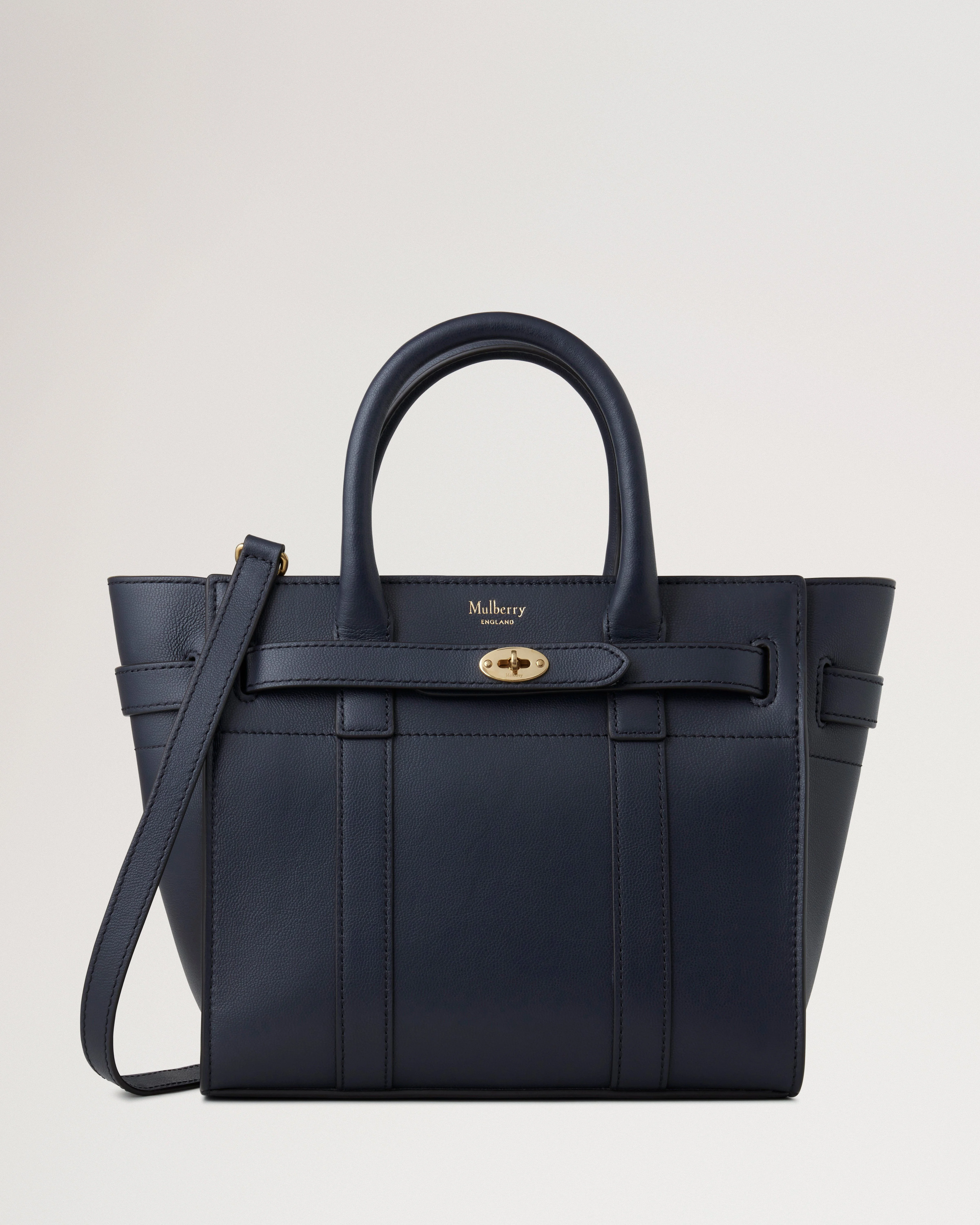 The Mini Zipped Bayswater features a modern zipped closure. Using the same construction as the iconic Bayswater, this style plays with detail, deconstructing the front by removing the flap and using the iconic Postman’s Lock to secure two belted straps. Details A mini version of the classic zipped shoulder bag. - Foil embossed Mulberry signature - Belt detailing with Postman's Lock hardware - Full zip closure - Two leather top handles - Adjustable and detachable leather strap - One main compartment - Internal slip pocket - Suede lining - Brass hardware finish Height 8¼" Width 9" Depth 5" Shoulder strap length Min 19¾" - Max 23¼" Handle drop 4" Material Micro Classic Grain A smooth calf leather with a micro grain and soft touch. This product's code is HH9089-587U888