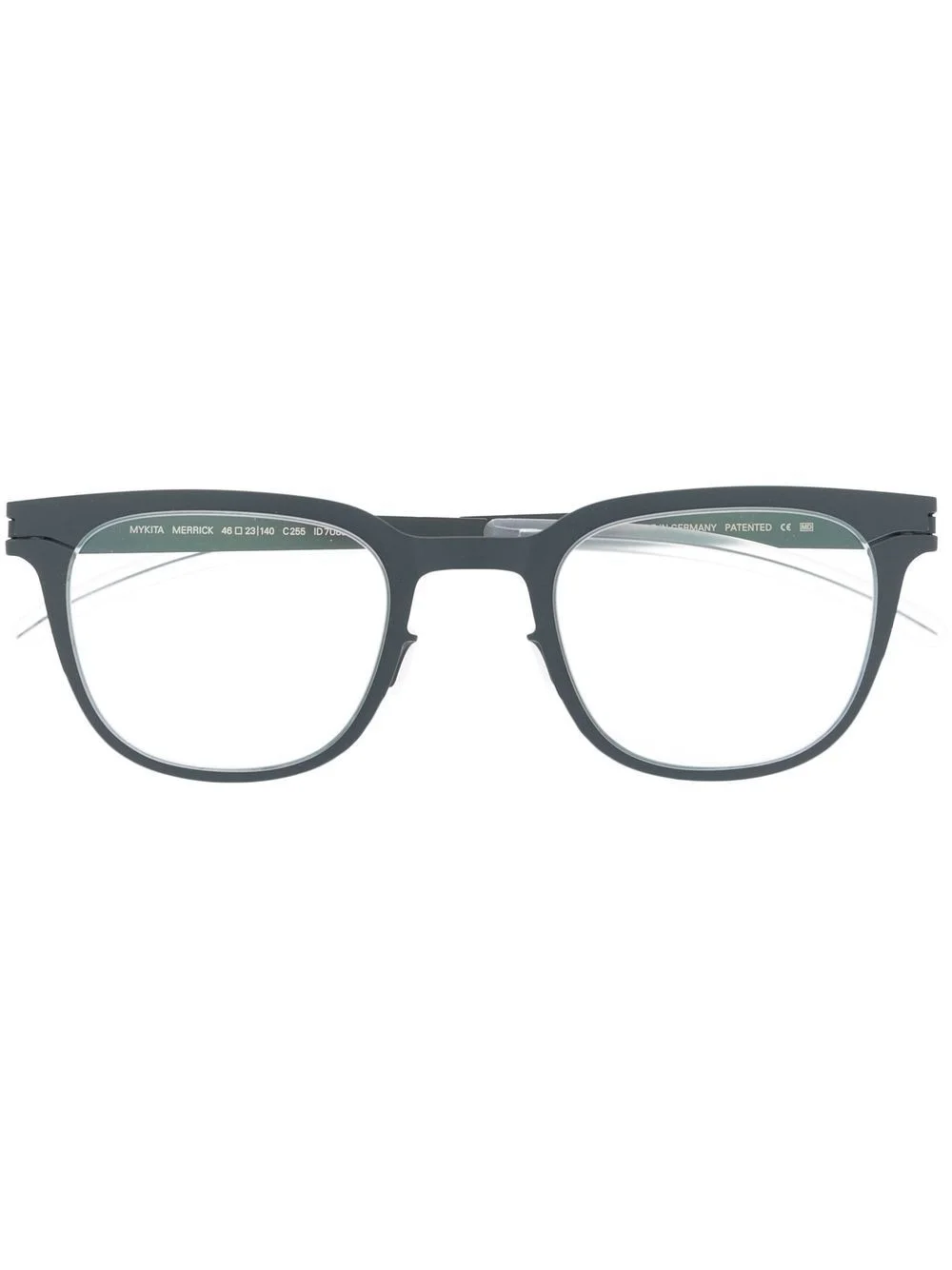 matte-finish square-frame glasses dark grey matte finish clear lenses square frame raised bridge straight arms curved tips These glasses come with a protective case. Imported Composition stainless steel 100% SIZE & FIT Measurement Arm Length 5.51 in(14 cm) Bridge Width 0.9 in(2.3 cm) Lens Diameter 1.81 in(4.6 cm) Total Width 5.27 in(13.4 cm)