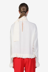 Long-sleeved blouse with a bow at the neck. The fabric is lightweight and shiny in ivory. The fit is loose and relaxed, with a ruffle trim at the hem and cuffs. The finish is clean and free of additional decorative elements. DETAILS Color: Ecru Composition: 69% AC 31% SE Product Code: 26EN2M0G05151111108 Made in Italy SIZE AND VESTIBILITY The model wears size 40 and is 179 cm tall. The item fits regular.