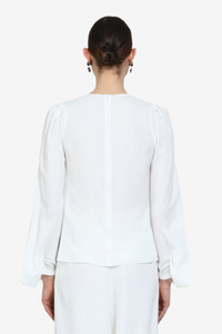 Blouse with long flared sleeves made of light and flowing white fabric. The fit is regular with a high neck and wide sleeves that widen towards the wrist. The back closure is with a hidden zip, ensuring a clean and linear look. The simple structure and lack of decorative details makes this garment versatile and suitable for different occasions. DETAILS Color: Cream Composition: 69%AC 31%SE Product Code: 25IN2M0G11151111102 Made In Italy SIZE AND VESTIBILITY The model wears size 40. The garment fits regular.